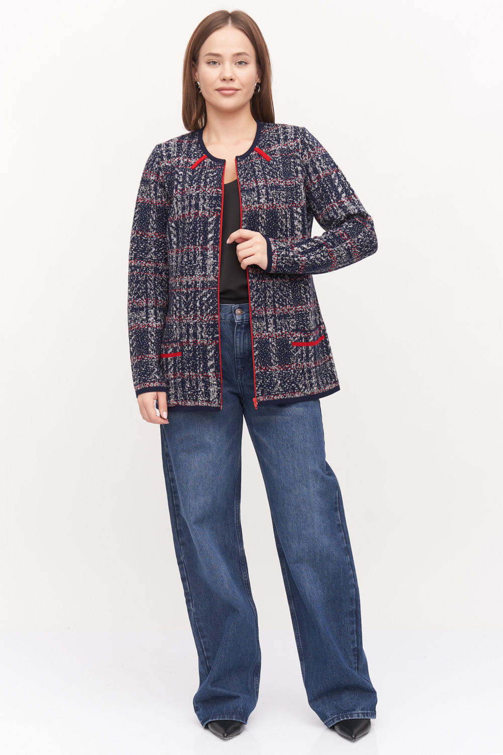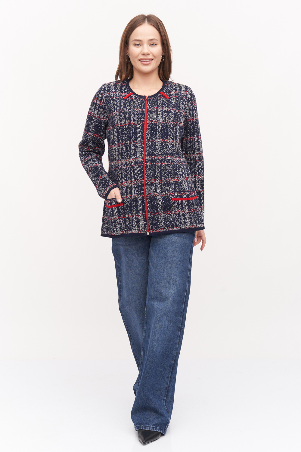 Женский жакет на молнии полуприлегающего силуэта. Горловина круглая обработана контрастной бейкой. Длинный втачной рукав, накладные карманы. Жакет выполнен жаккардовым переплетением с классическим узором клетка с добавлением акцентных красных деталей.  Жакет очень комфортный, прекрасно садится на любой тип фигуры. Отличный как повседневный. так и деловой вариант. синий