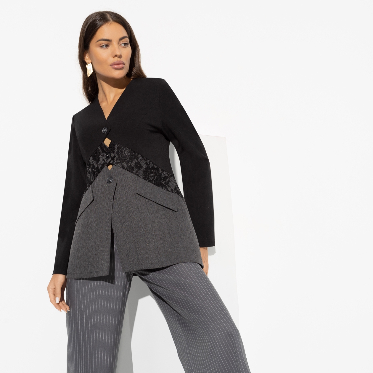 Скажите твердое «Нет!» заурядности. Жакет, который вы выбрали, будет отличаться от всех остальных. Нетривиальный крой линии застежек. Сочетание кружевной и костюмной ткани. Пример эффектности. Приталенный силуэт, имитация карманов. Застегивается на пуговицы. Декоративный крой по спинке изделия.