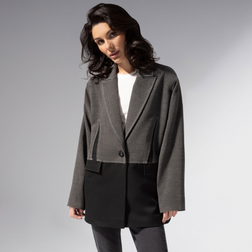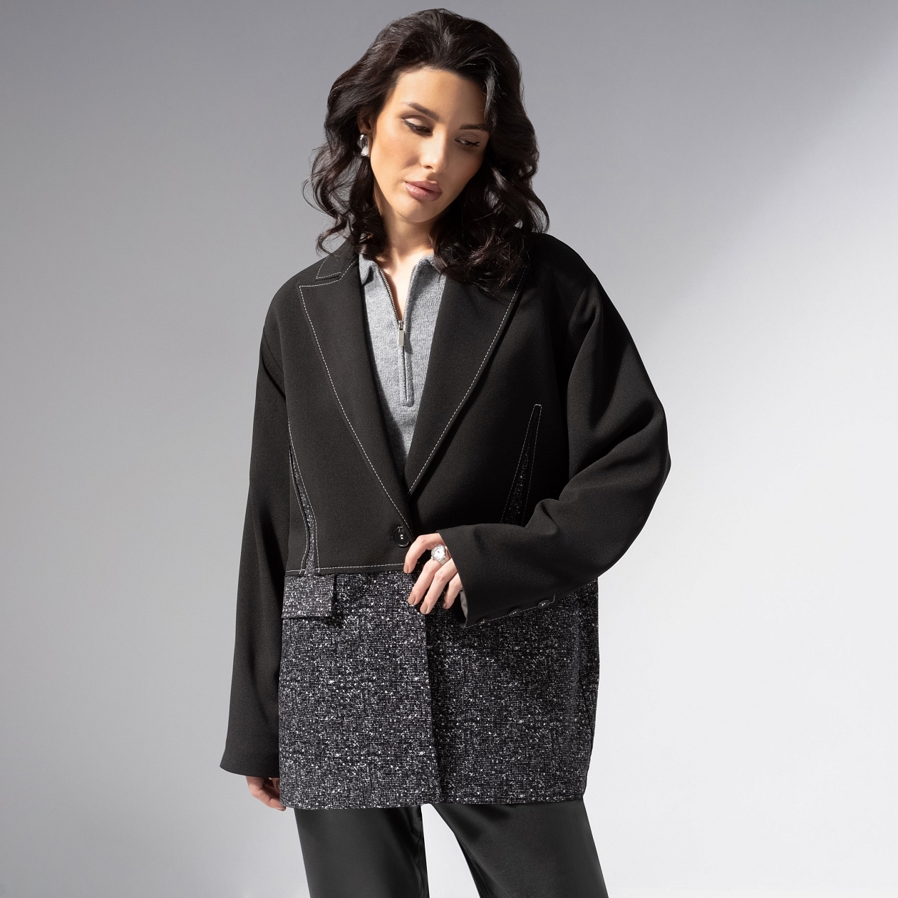 Этот жакет – как шахматная королева: спокойный, но стратегически точный. Дизайнеры ЧАРУТТИ сделали ставку на контраст гладкости и шероховатости, превратив классику в арт-объект. Для тех, кто видит силу в деталях. Модель свободного кроя с геометричными линиями и контрастной нижней вставкой. Сочетание трёх тканей: «пикачо», флак и «плат кагзи». Одинарная застёжка, английский воротник, декоративные швы. Жакет свободной посадки на подкладе с подплечниками.