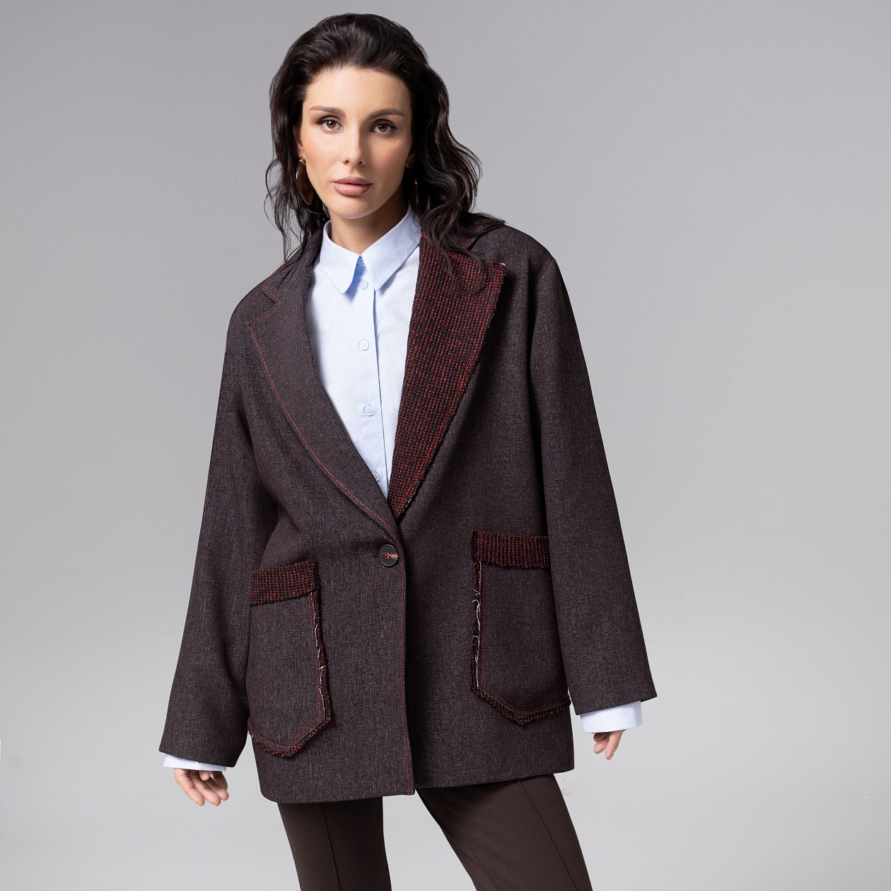 Женский объемный жакет ЧАРУТТИ в глубоких коричнево-бордовых оттенках выполнен в стиле «с мужского плеча». Изделие сочетает в себе мощь классического кроя и утонченную элегантность. На спинке дизайнерский принт. Его модный силуэт, акцентированный выразительными лацканами и объемными карманами, подчеркивает хрупкость фигуры, создавая эффектный контраст. Высокое качество пошива проявляется в безупречной посадке, точном структурировании формы и использовании роскошных материалов. Продуманная конструкция с яркой износостойкой подкладкой обеспечивает комфорт и сохраняет безупречный вид даже при длительном ношении. Ткань с легким блеском. Жакет с подплечниками.