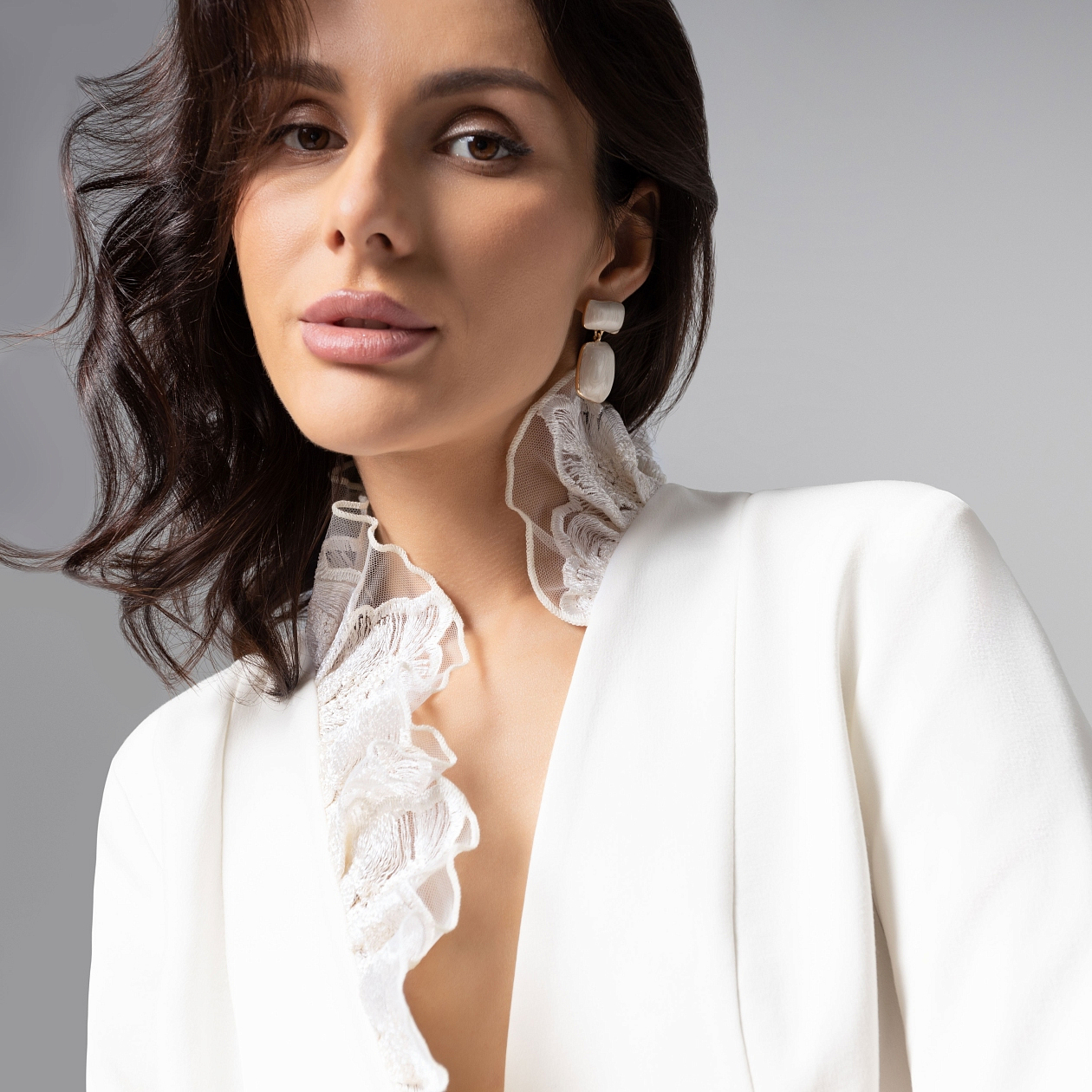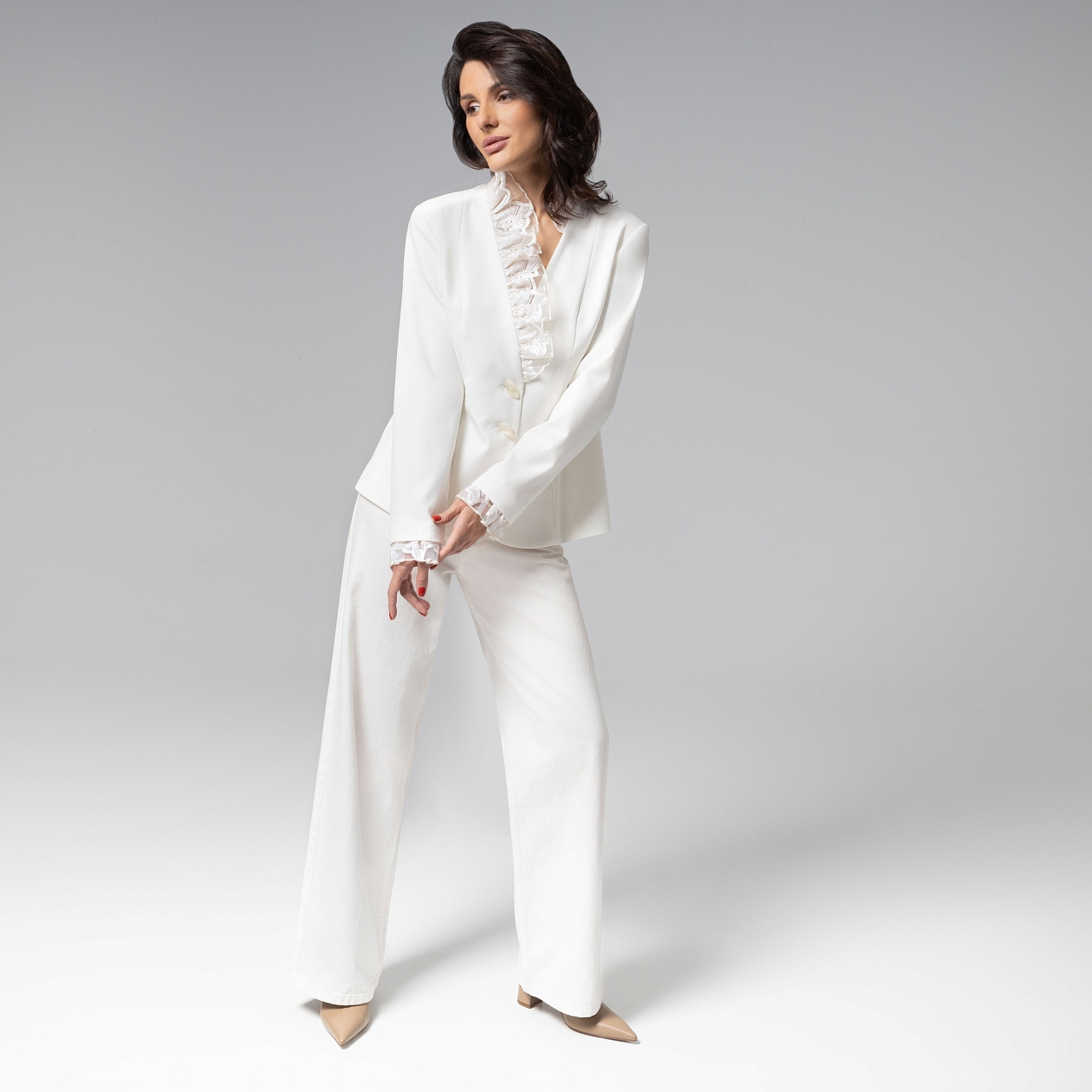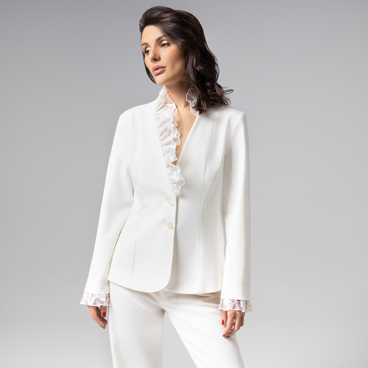 Современная классика с романтичной нотой. Молочный жакет ЧАРУТТИ превращает любой образ в воплощение безупречного вкуса. Мягкий светлый оттенок подчеркивает утончённость, а фактура и вышивка добавляют лёгкий аромат роскоши. Жакет полуприлегающего силуэта из костюмной ткани «тиаф». Акцент – отделка из сетки с вышивкой. Застёжка на пуговицу, внутренние вытачки формируют женственный контур.