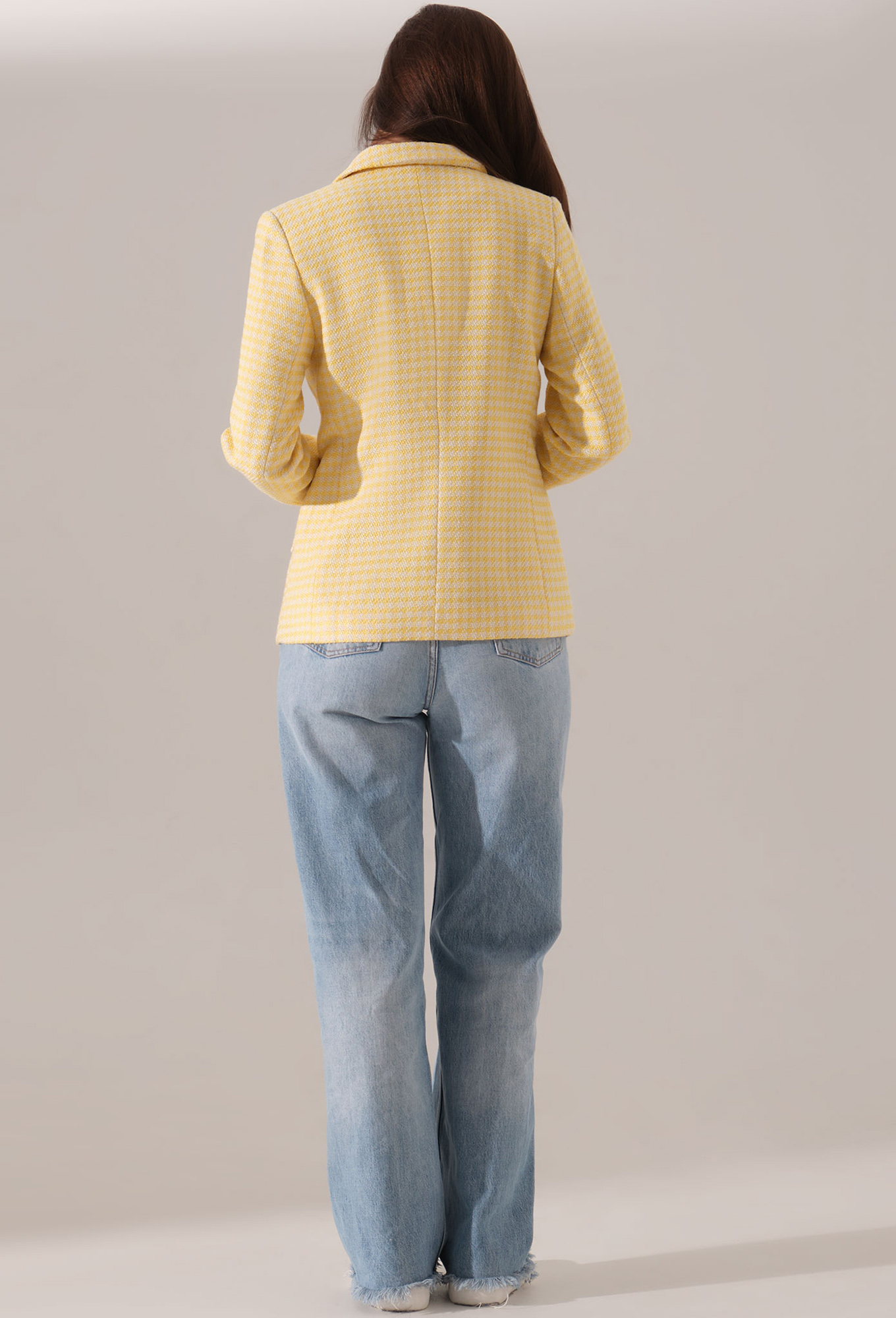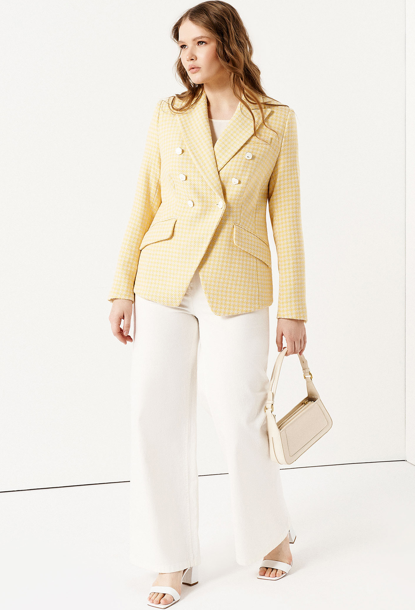 Модель: Панда 132830 жёлтый Рост:..показать 164 см (девушка на фото ростом 170см) Сезон: Круглогодичный Тип ткани: Жакет- Хлопок 48%, полиэстер 32%, акрил 20%.Подкладка- Полиэстер 55%; вискоза 45%.Двубортный жакет из твида.