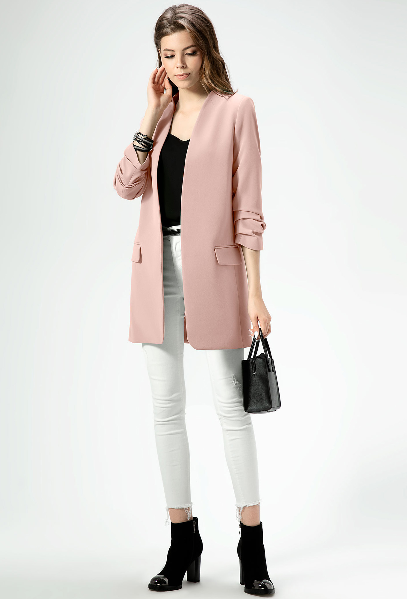 Модель: Панда 453530 розовый Рост..показать: 164 см (девушка на фото ростом 170см) Сезон: Круглогодичный Тип ткани: Полиэстер 94%, эластан 6%Стильный модный жакет в стиле "кэжуал". Это повседневный удобный и практичный жакет, который отлично сочетается как с джинсами, так и с брюками. Жакет удлиненный, без застежки, рукава длиной ниже локтя. По переду имеются карманы. Спинка со средним швом, который заканчивается шлицей. Жакет на подкладки.