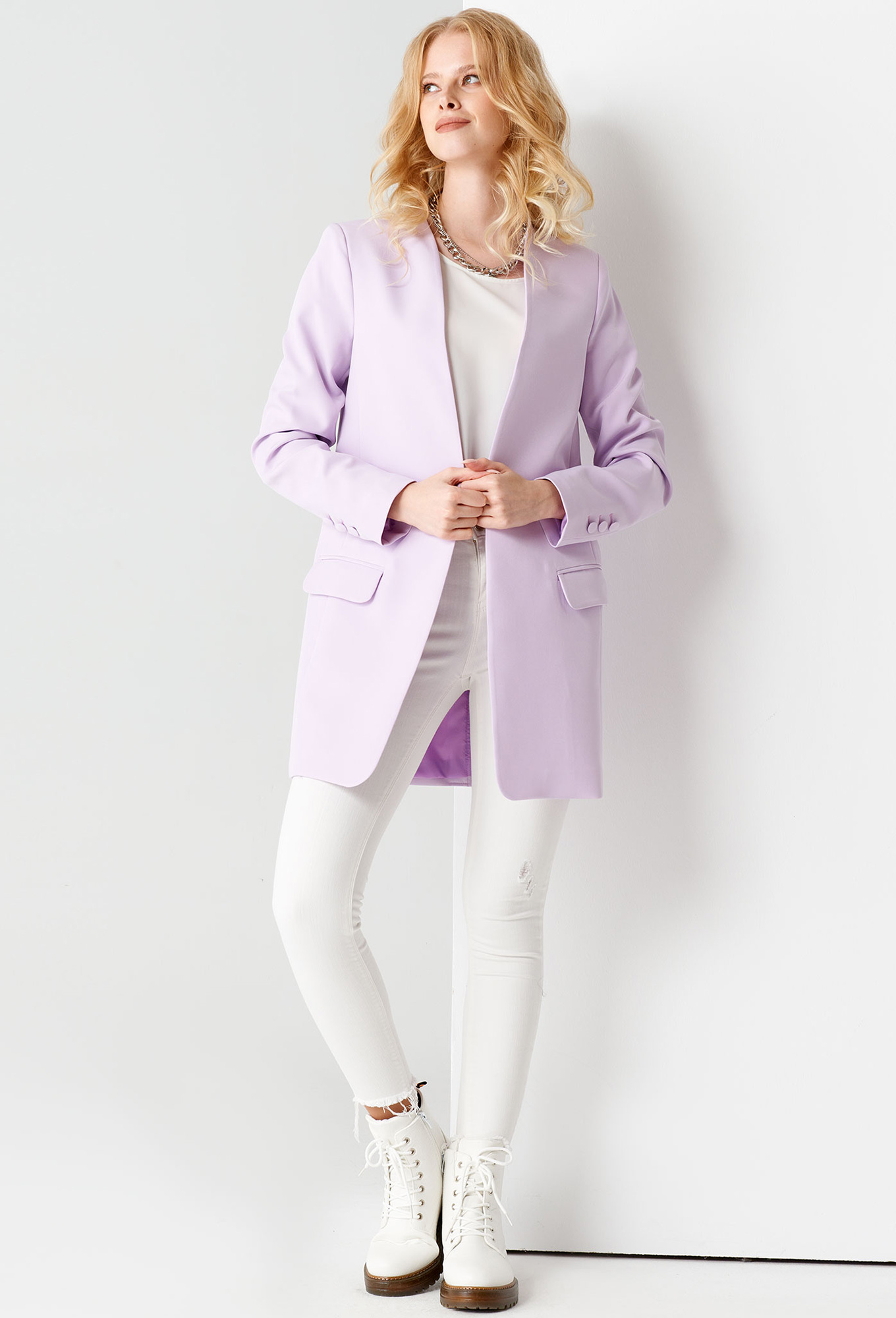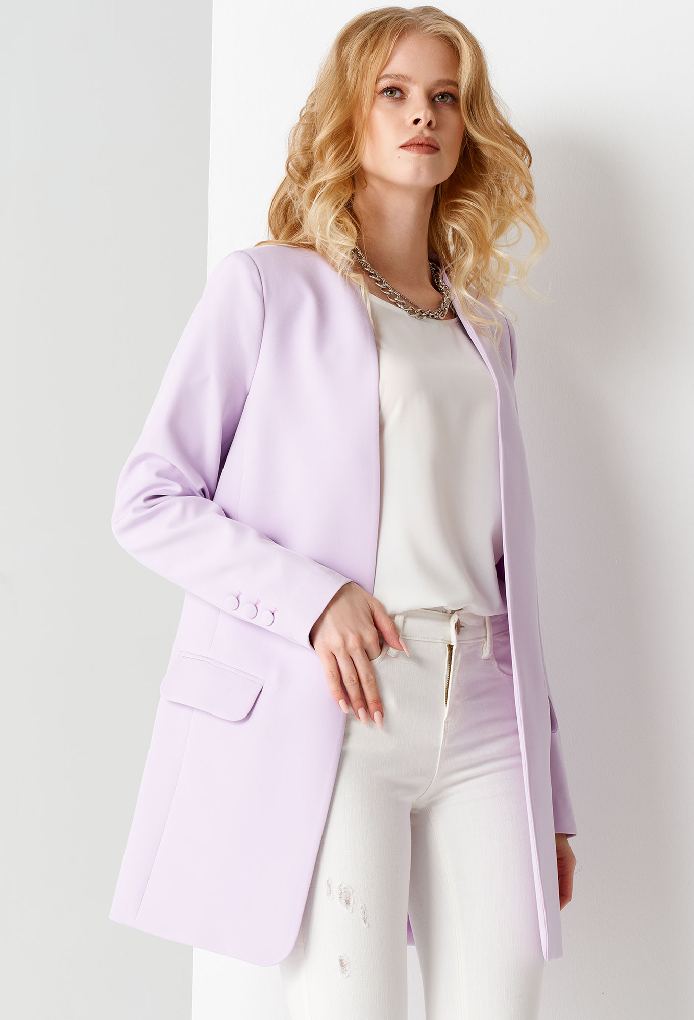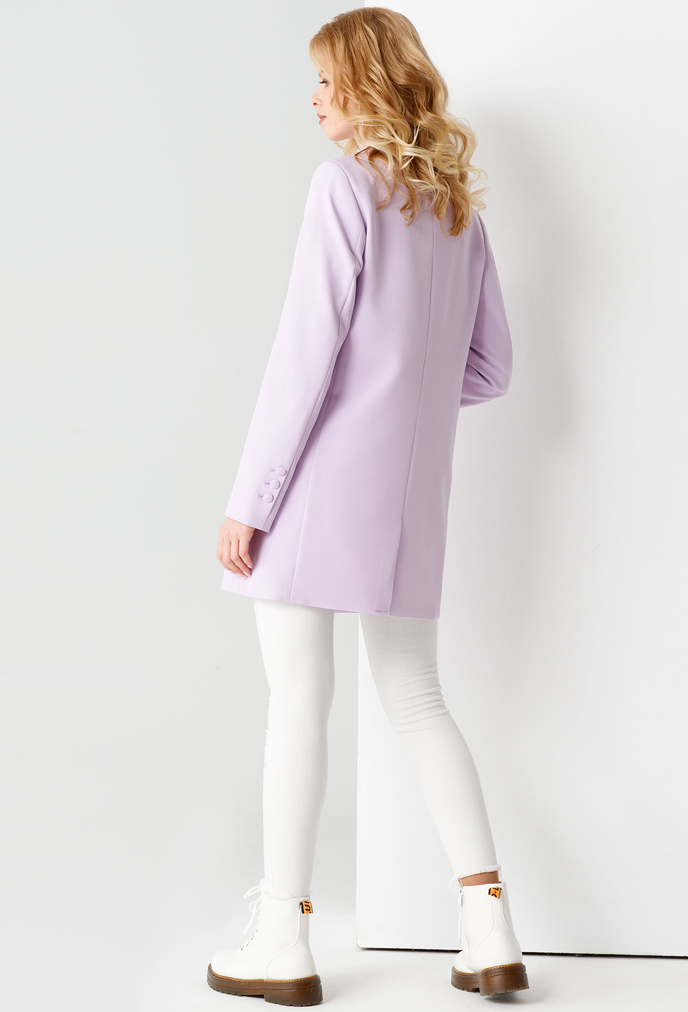 Модель: Панда 58830 лиловый Рост:..показать 164 см (девушка на фото ростом 170см) Сезон: Круглогодичный Тип ткани: Жакет- Полиэстер 94%, эластан 6%Подкладка- Полиэстер 100%Стильный модный жакет. Это повседневный удобный и практичный жакет, который отлично сочетается как с джинсами, так и с брюками. Жакет удлиненный, без застежки, рукава длинные. По переду имеются карманы с клапаном. Жакет на подкладки.