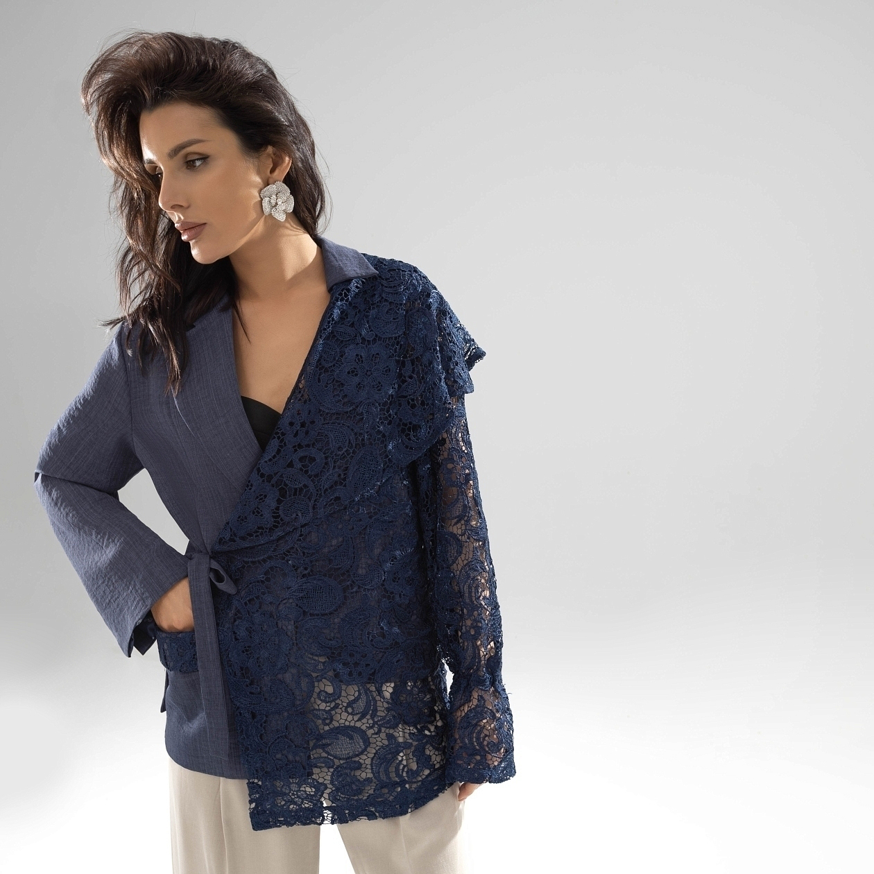 Глубокий цвет ночного неба воплощен в комбинации двух видов ткани. Кружево, как символ романтичности, и костюмная ткань, как символ элегантности. Безупречное качество пошива. Жакет из двух видов ткани. Завязка на поясе. Расслабленный свободный крой подойдет любом типу фигуры.
