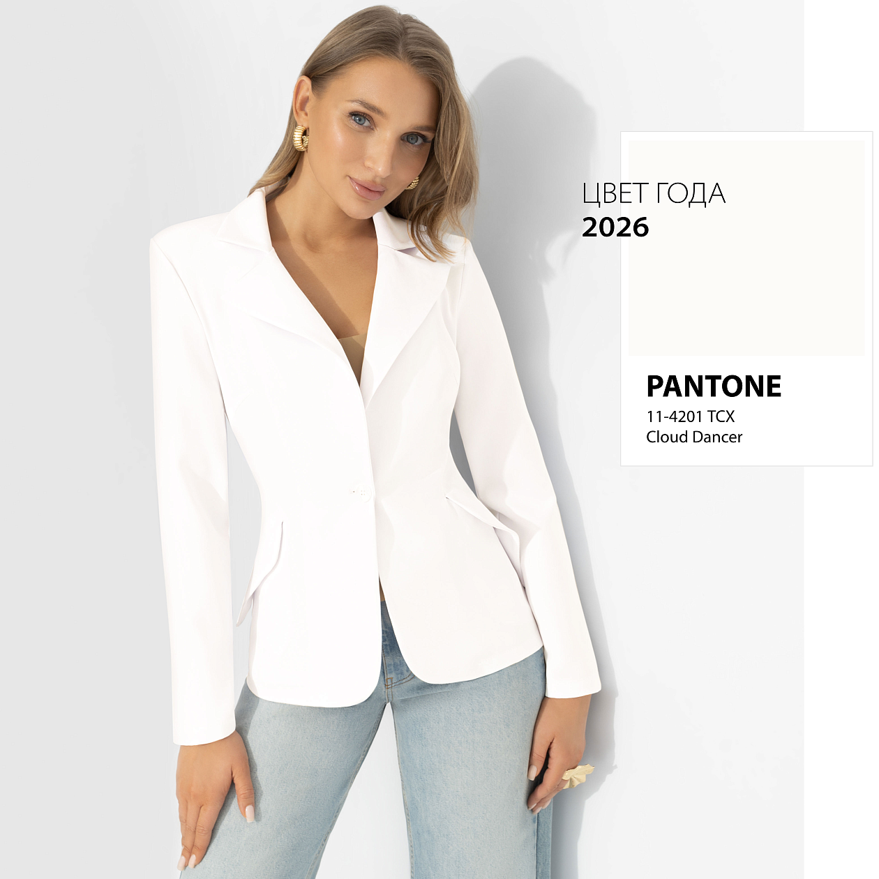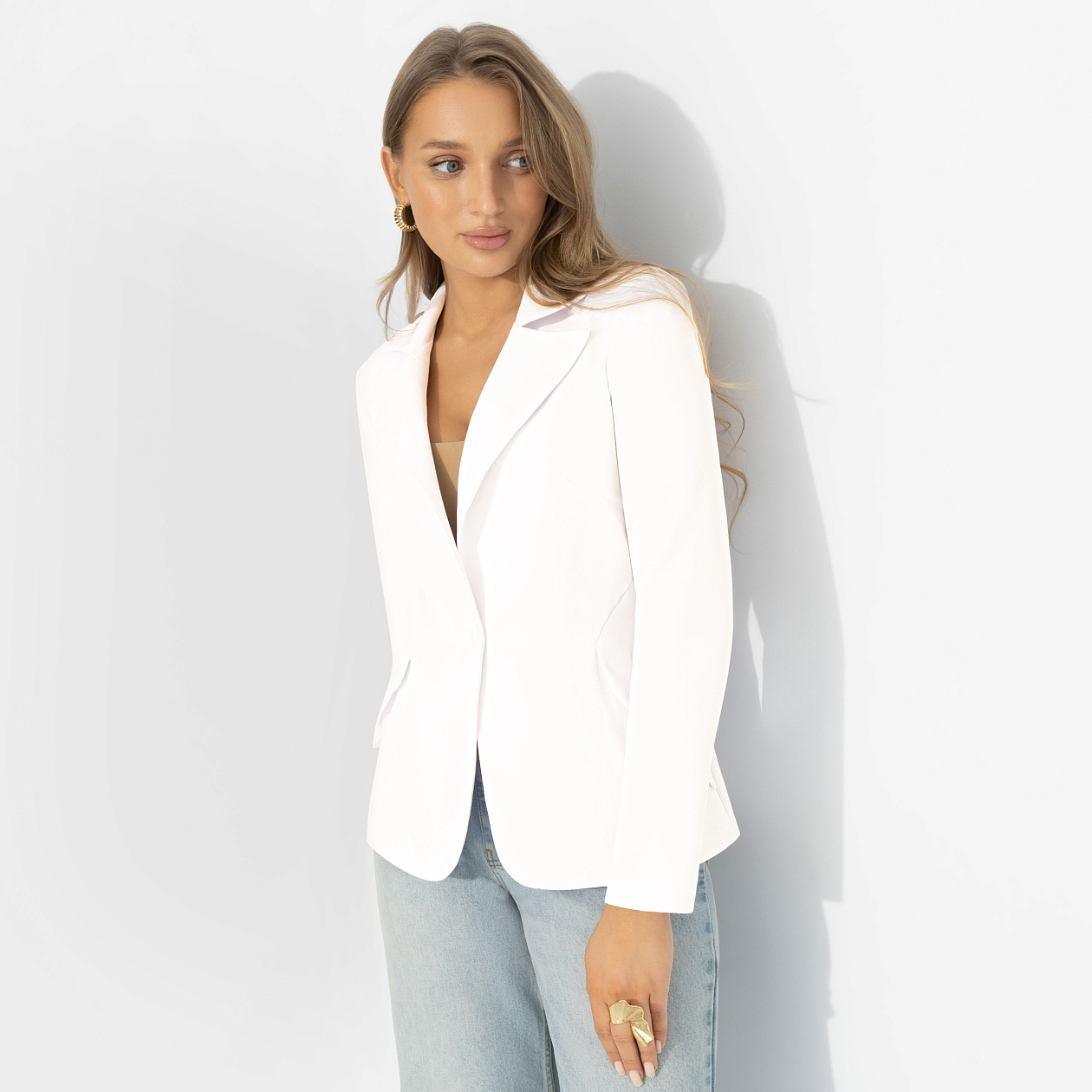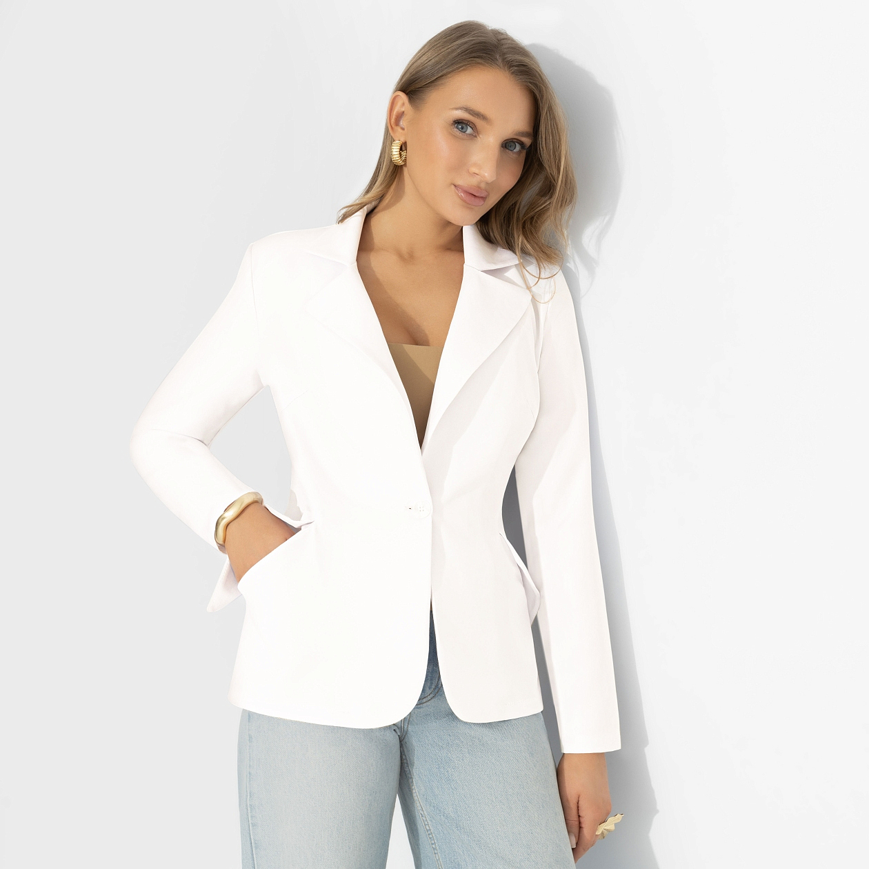 Интересный факт: оттенки белого цвета на подиумах считают самыми сложными – светлый цвет не прощает ошибок и сразу выдает качество кроя. Именно поэтому в тренде сейчас фасоны с идеальной посадкой. Жакет «Шоу-показ» – про тот самый уверенный оттенок белого: чистый, собранный, роскошный без единого элемента декора. Приталенный силуэт жакета подчеркивает фигуру, четкая линия плеч формирует осанку, классические лацканы добавляют статусности образу. Жакет с карманами.