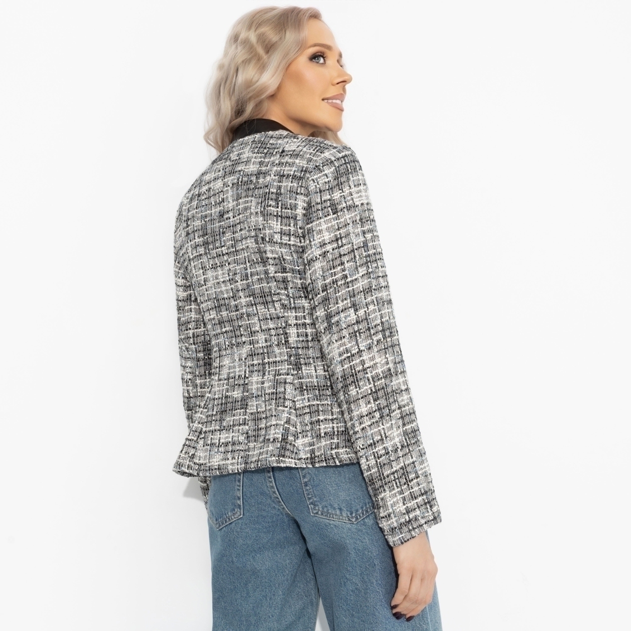 Жакет ЧАРУТТИ – чистая мода без компромиссов. Твид «Шанель» с переплетением чёрного, белого, голубого и деликатных золотых нитей отсылает к показам CHANEL, ERDEM, ROCHA и CAROLINA HERRERA сезона осень-зима 2025/26. Приталенный силуэт с акцентом на плечи подчёркивает талию и формирует идеальную фигуру. Декоративные клапаны, кожаные пуговицы и воротник-стойка работают как ювелирные изделия. Легко стилизовать с джинсами, брюками или юбкой.
