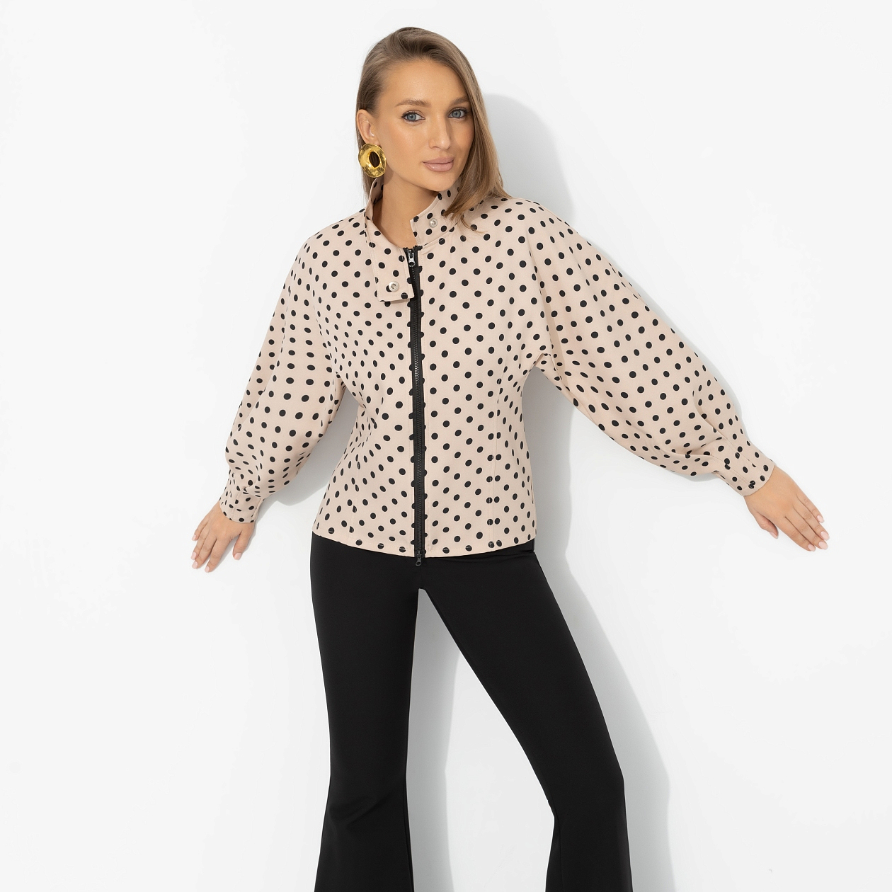 Она знала: её сильная сторона – не громкость, а стиль. Жакет в контрастный горох сначала кажется игривым, но дизайнерские рукава добавляют характер и драму. Один жест – и акценты расставлены. В нём можно улыбаться мягко, а решения принимать жёстко. И пусть гадают, что именно делает вас такой уверенной.
