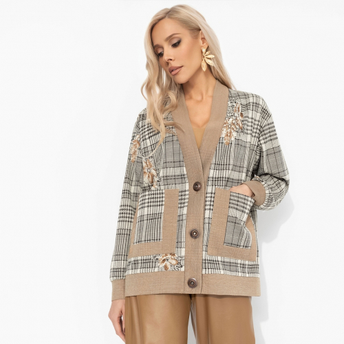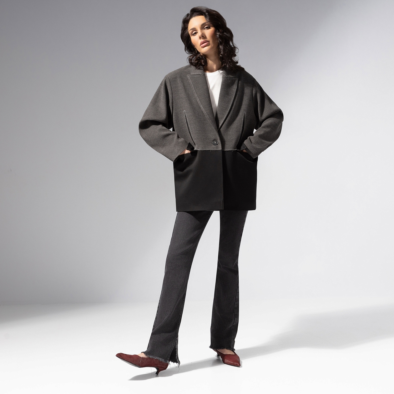 В жизни, как в шахматах, решительный ход делает сильная фигура. Жакет ЧАРУТТИ – про уверенность и умение управлять вниманием. Монохром, игра фактур и архитектурный крой – всё, что нужно для победного образа. Комбинированный жакет из двух видов костюмной ткани. Чёткая линия плеч, свободный силуэт, застёжка на одну пуговицу. Акцентные швы и геометричные вставки.