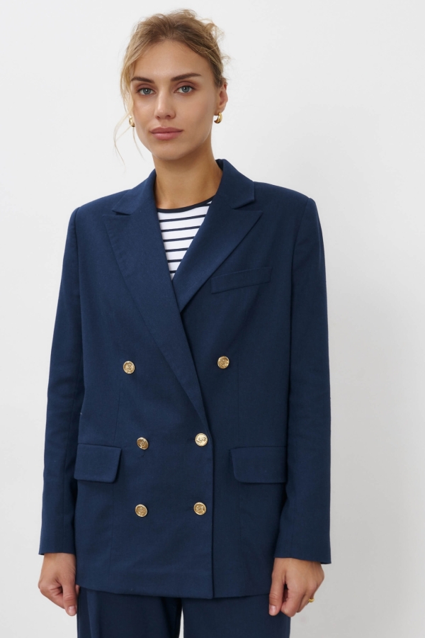 Жакет из костюмного льна - must have для любого гардероба. Воротник английский. По переду двубортная застёжка на петли и пуговицы, декоративные клапаны. По спинке открытая шлица. Изделие на хлопковом подкладе. Рукава оформлены декоративной шлицей и пуговицами.