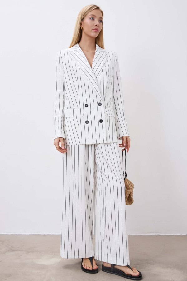 Жакет из костюмного полотна. Воротник английский. По переду двубортная застёжка на петли и пуговицы, декоративные клапаны. По спинке открытая шлица. Изделие на хлопковом подкладе.