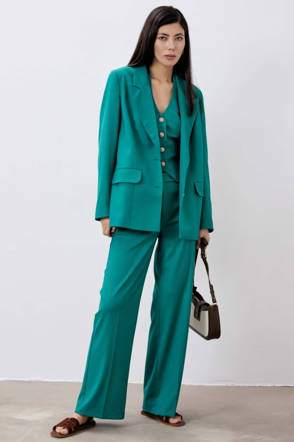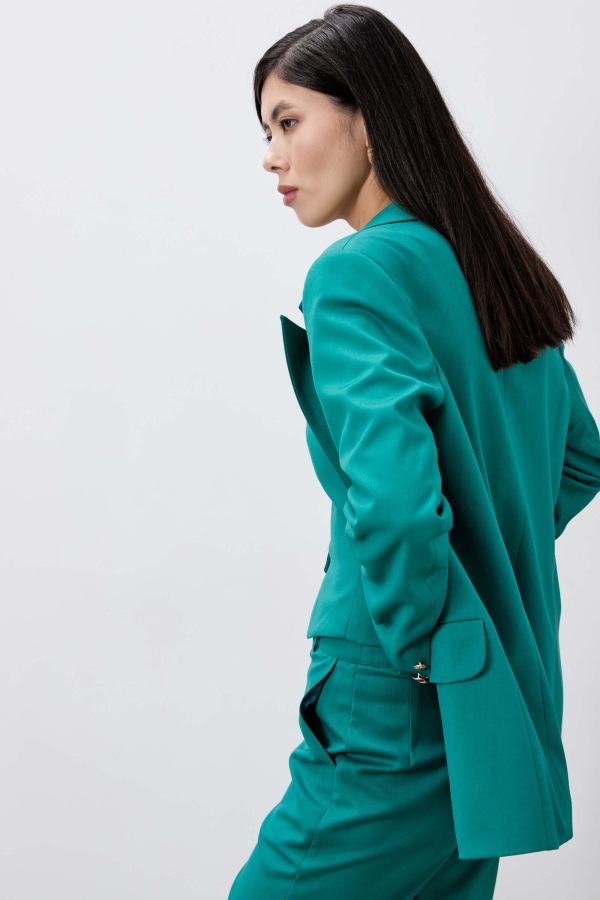 Жакет из костюмного полотна. Свободный силуэт. Воротник пиджачный. По переду застёжка на петли и пуговицы, карман прорезной. По спинке шлица и на рукавах. Рукав длинный. Изделие на подкладе.