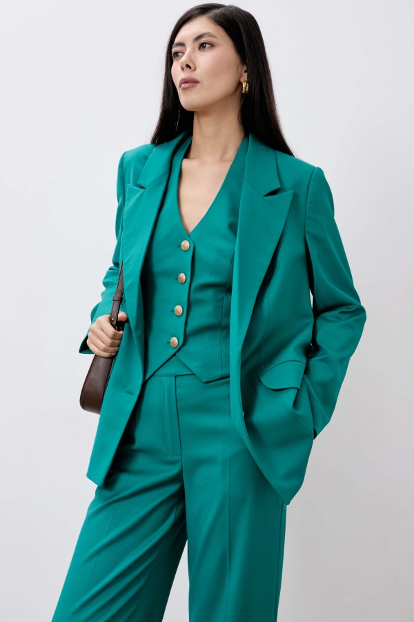Жакет из костюмного полотна. Свободный силуэт. Воротник пиджачный. По переду застёжка на петли и пуговицы, карман прорезной. По спинке шлица и на рукавах. Рукав длинный. Изделие на подкладе.