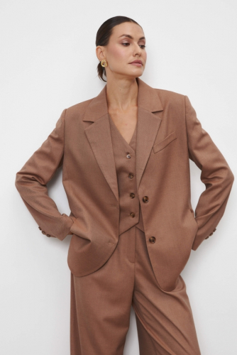 Жакет из костюмного полотна. Свободный силуэт. Воротник пиджачный. По переду застёжка на петли и пуговицы, карман прорезной. По спинке шлица и на рукавах. Рукав длинный. Изделие на подкладе.