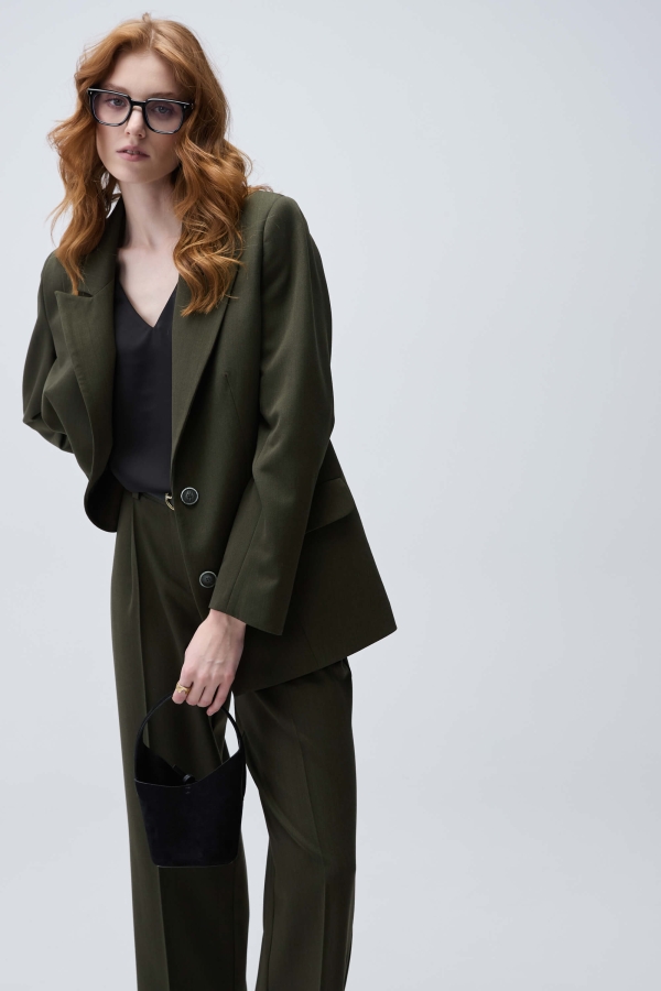 Жакет из костюмного полотна. Свободный силуэт. Воротник пиджачный. По переду застёжка на петли и пуговицы, карман прорезной. По спинке шлица и на рукавах. Рукав длинный. Изделие на подкладе в тон.