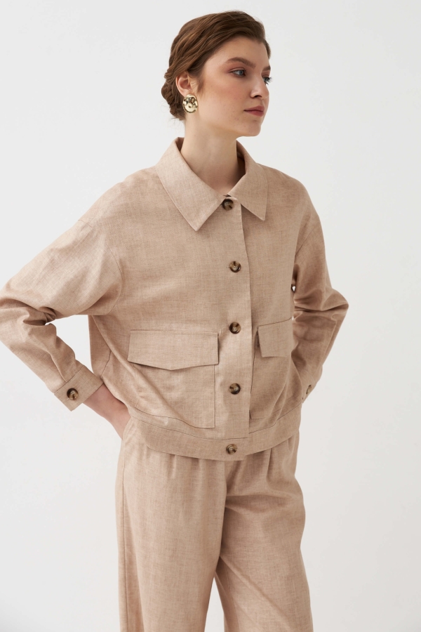 Комфортный жакет из льняного полотна. Модель свободного силуэта со спущенной линией плеча. Воротник отложной. Длинный рукав на манжете. По переду накладные карманы. По спинке кокетка. Изделие на притачном поясе. Застёжка на пуговицы.