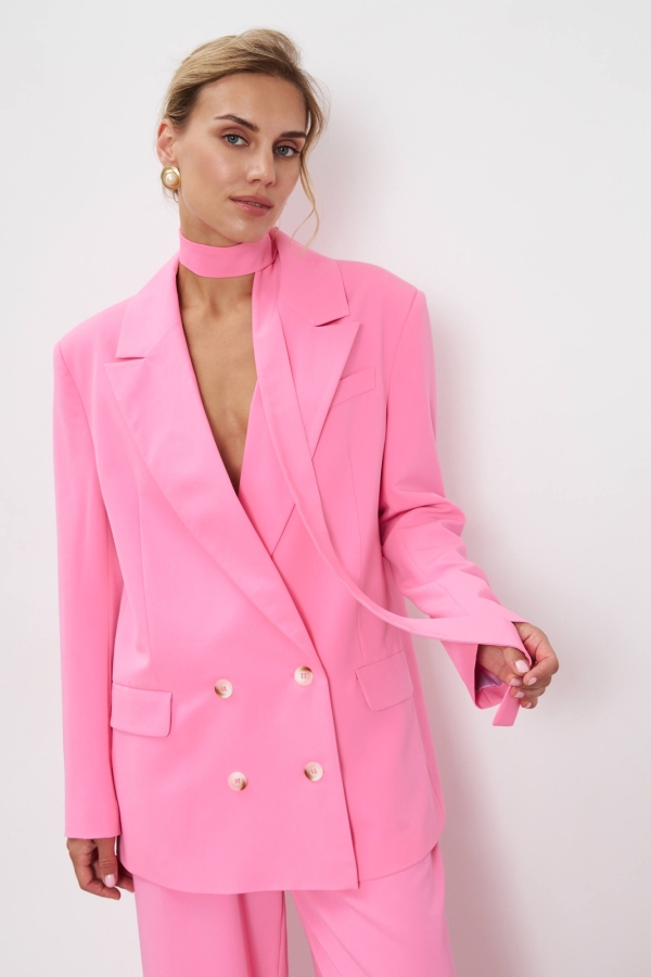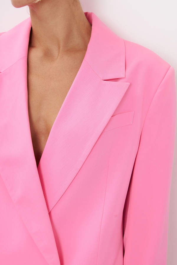 Свободный жакет в трендовом оттенке. Двубортный жакет свободного силуэта. Рукав втачной, присутствуют прорезные карманы с клапанами. По спинке шлица.
