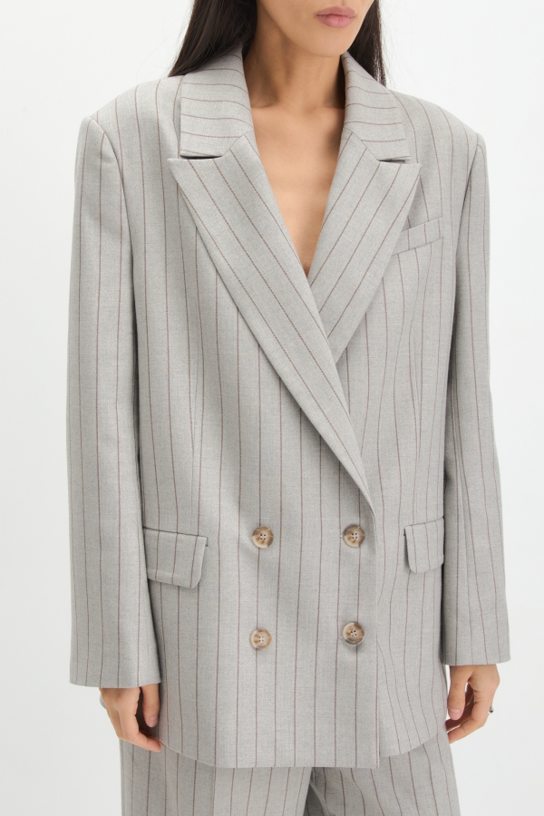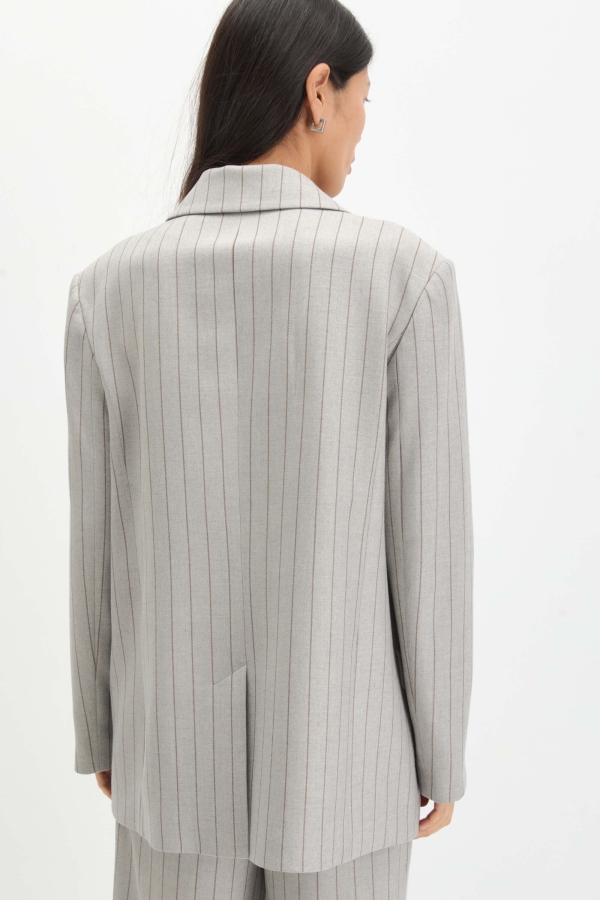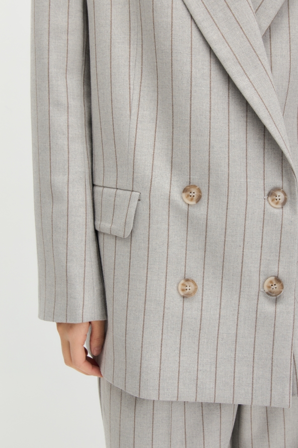 Жакет свободного кроя в полоску. Двубортный жакет свободного силуэта. Рукав втачной, присутствуют прорезные карманы с клапанами. По спинке шлица. Изделие на подкладке.