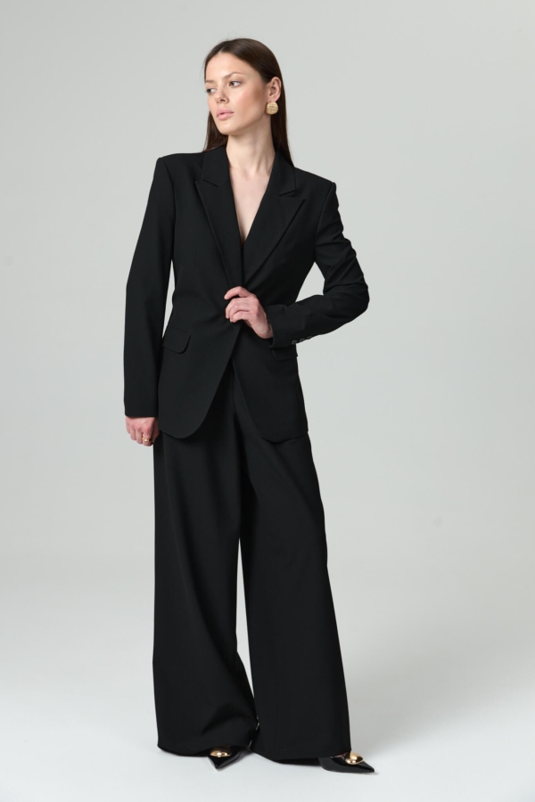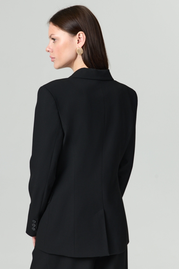 Базовый жакет умеренного объема из костюмной поливискозы. Модель полуприлегающего силуэта. Классический английский воротник с лацканами. Прорезные карманы с клапаном. По спинке шлица. Изделие на подкладке из поливискозы.