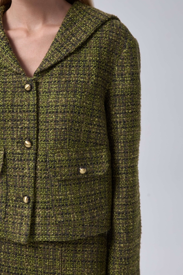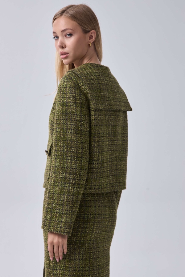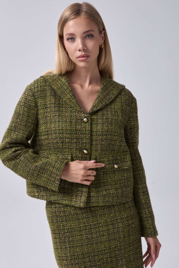Укороченный жакет из твида с акцентным воротником. Модель свободного силуэта. Рукав спущенный, свободный. По переду застежка на петли и пуговицы акцентные. Воротник широкий отложной. Изделие на подкладе.