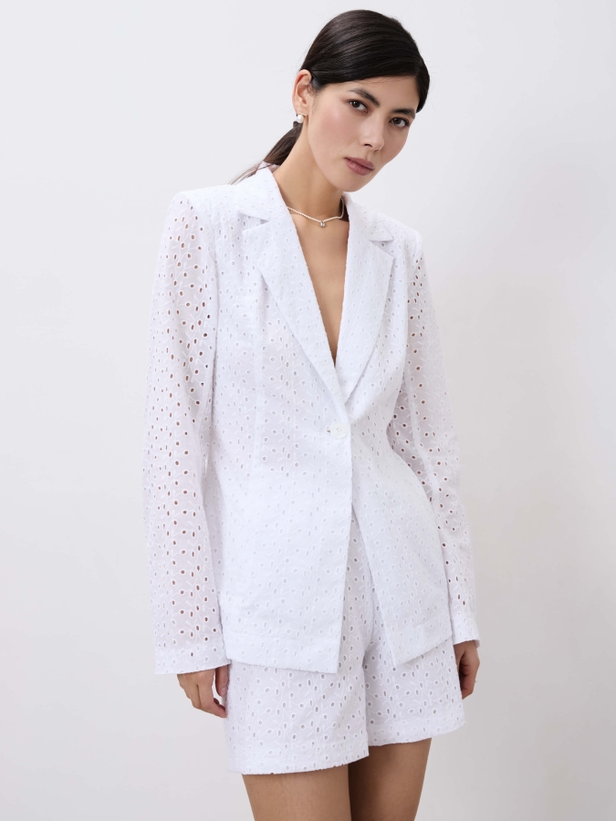 Стильный легкий жакет из хлопкового шитья на подкладке из батиста. Приталенный жакет умеренного объема, однобортный, с английским воротником.