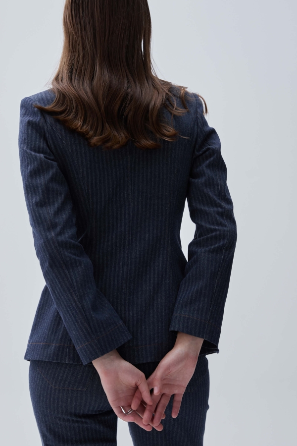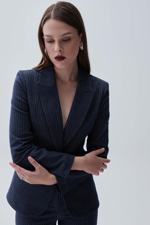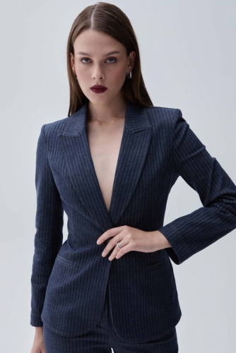 Жакет из денима прилегающего силуэта. Силуэт приталенный, воротник английский. Застежка на пуговицу.