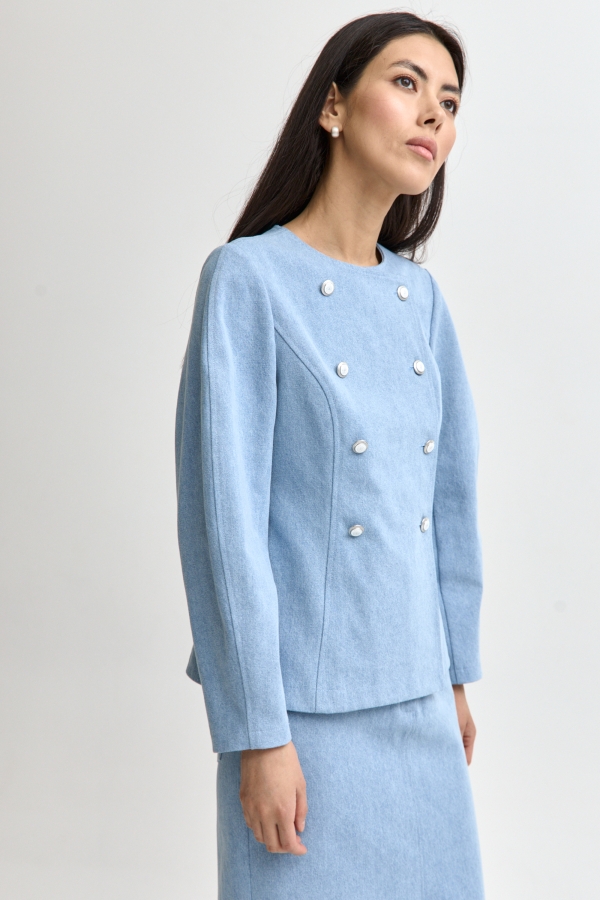 Элегантный жакет из джинсового полотна. Модель прилегающего силуэта. По переду двубортная застежка. Рукав втачной формы “фонарик”. В комплекте пояс из основной ткани с пряжкой. Изделие без подклада.