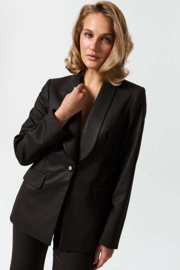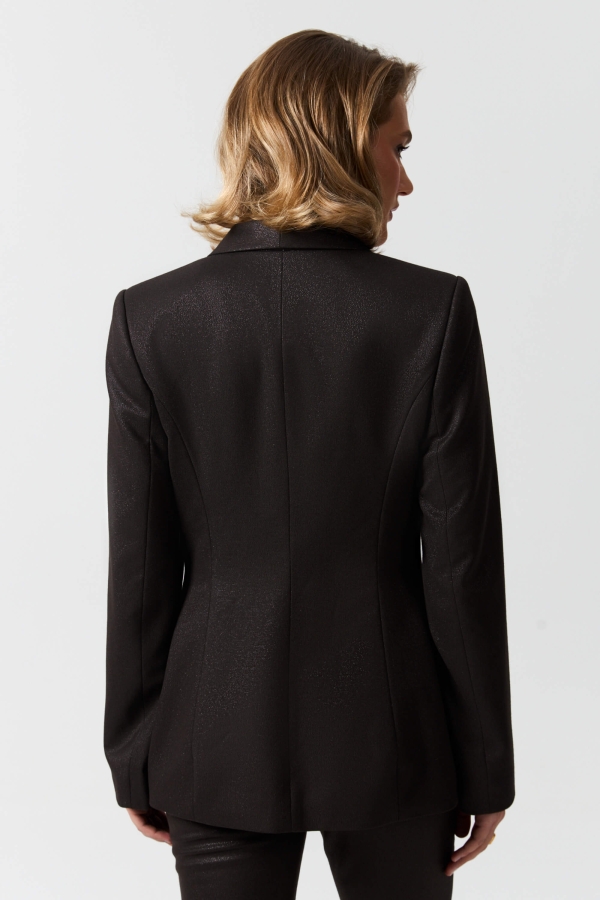 Жакет из костюмного полотна в шоколадном цвете с шиммером. Модель полуприлегающего силуэта. Рукав втачной. Воротник классический шалевый. Застежка на петлю и акцентную пуговицу. Изделие на поливискозном подкладе в тон.