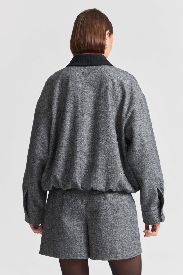 Бомбер из костюмного полотна с шерстью и контрастным воротником. Свободная модель на подкладке из поливискозы, контрастный воротник из вельвета. Рукав спущенный, супатная застежка на пуговицах. По низу изделия внутренняя резинка, на рукавах отрезные манжеты на пуговицах.