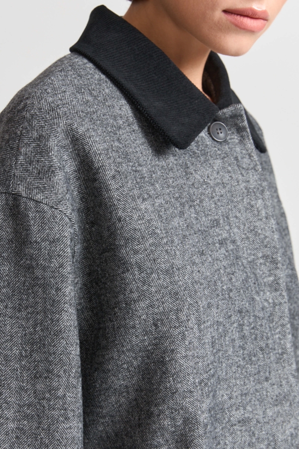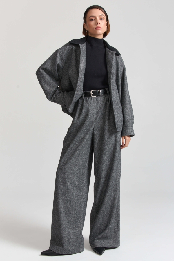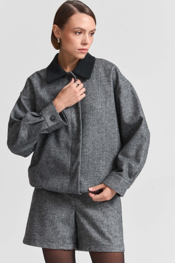 Бомбер из костюмного полотна с шерстью и контрастным воротником. Свободная модель на подкладке из поливискозы, контрастный воротник из вельвета. Рукав спущенный, супатная застежка на пуговицах. По низу изделия внутренняя резинка, на рукавах отрезные манжеты на пуговицах.