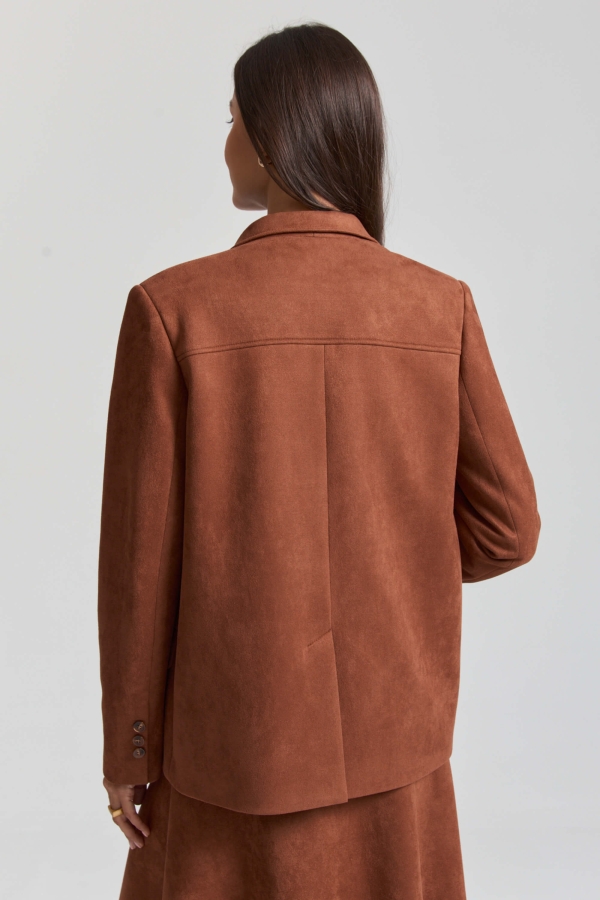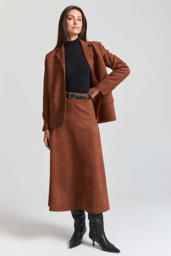 Трендовый жакет из эко-замши. Модель прямая, свободная с небольшим английским воротником. Кокетка на полочке и спинке, шлица на спинке и на рукавах. Прорезные карманы.
