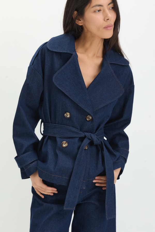 Укороченный жакет-тренч из плотного денима. Модель свободного силуэта с отлетной кокеткой по спинки и декоративными строчками. Рукав спущенный с патой на пуговицу. Застежка на петли и акцентные пуговицы. Пояс из основной ткани в комплекте, шлевки в боковом шве.