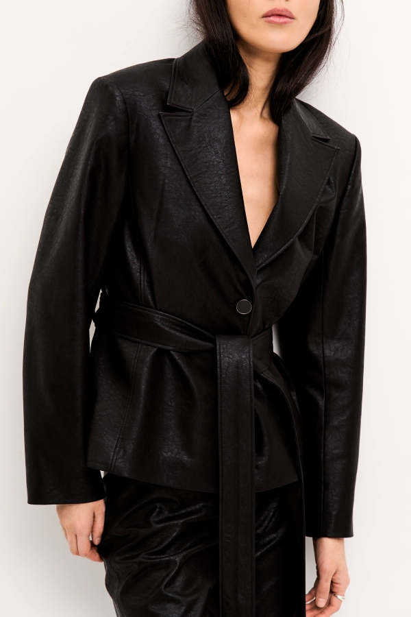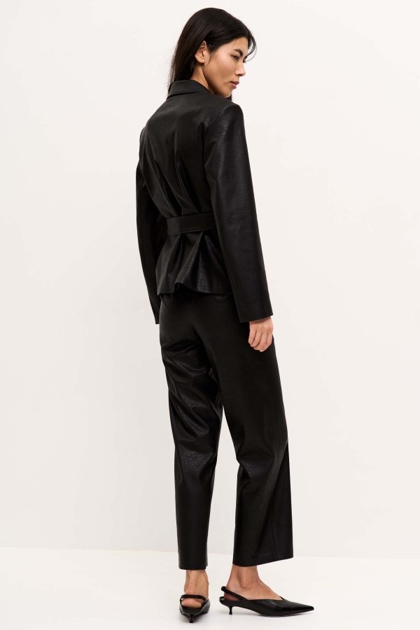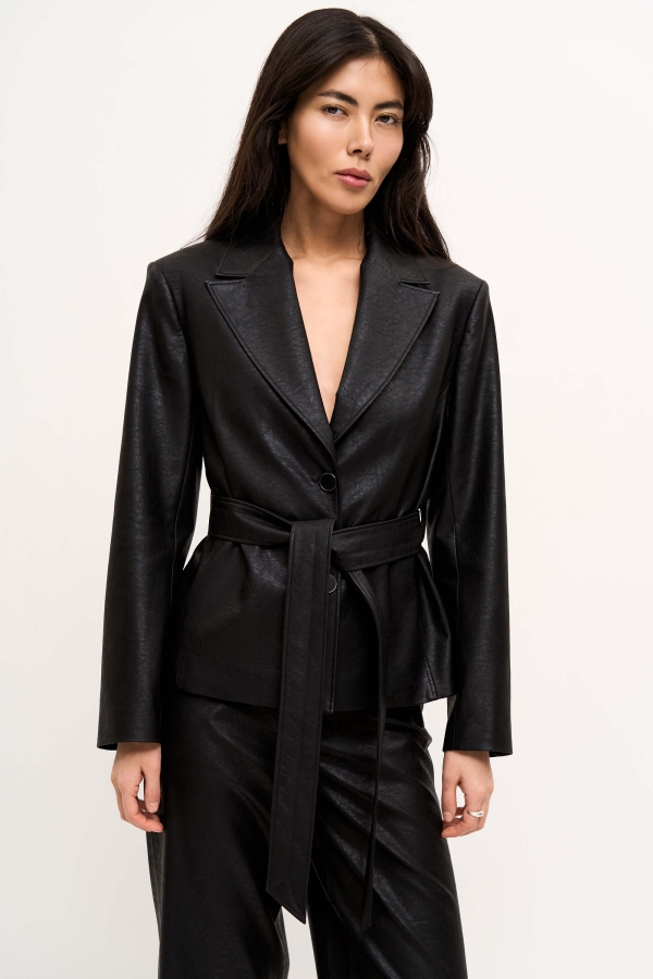 Жакет из фактурной эко-кожи на подкладке. Модель прямого силуэта с однобортной застежкой на петли и пуговицы. Воротник английский. Втачной рукав. Боковые рельефные швы. Пояс из основного материала в комплекте.