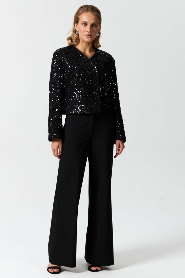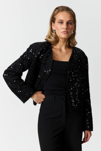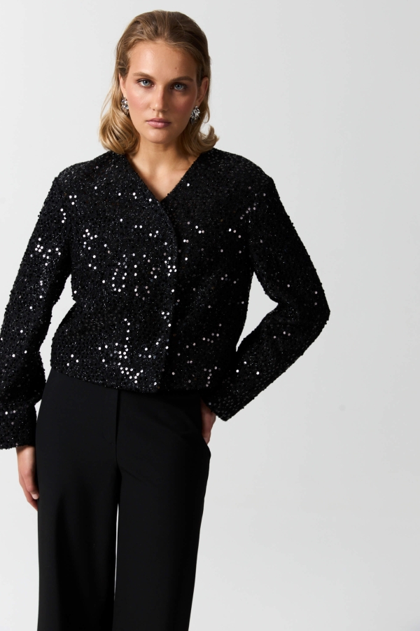 Жакет из твида с пайетками и ассиметричной застежкой. Модель свободного силуэта с асимметричной застежкой на кнопки. Рукав втачной. Изделие на подкладе.