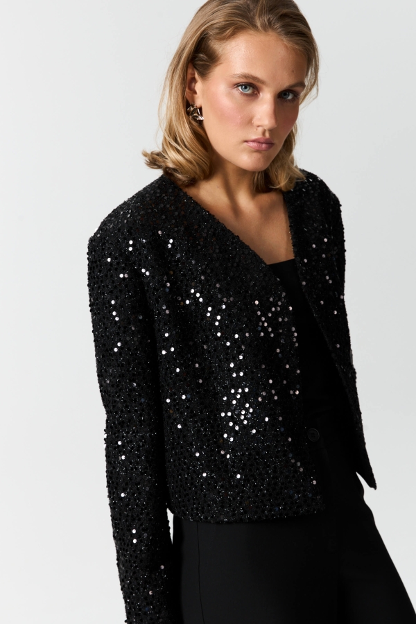 Жакет из твида с пайетками и ассиметричной застежкой. Модель свободного силуэта с асимметричной застежкой на кнопки. Рукав втачной. Изделие на подкладе.