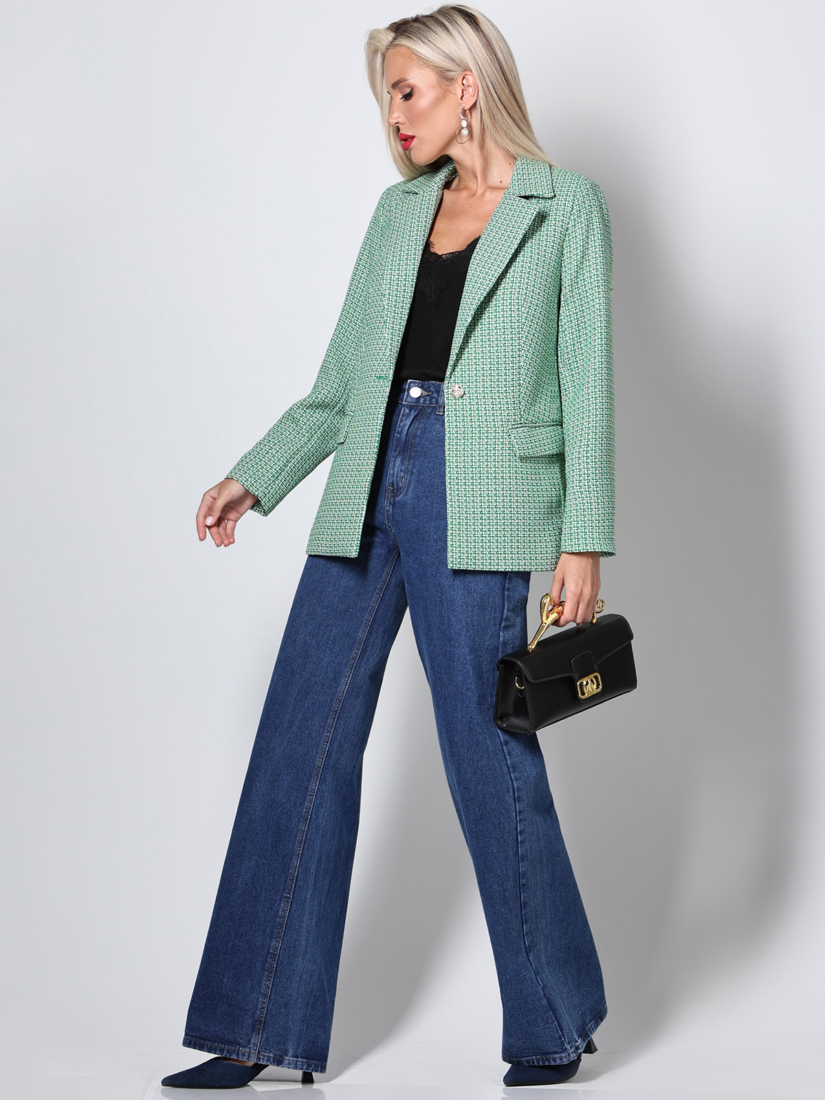 Жакет выполнен из костюмной ткани, обеспечивая элегантный и профессиональный вид. Зеленый цвет делает его универсальным и легко сочетаемым с различными элементами гардероба. Застежка на пуговицу обеспечивает легкость при надевании и снятии, а также добавляет изысканности образу. Отложной воротничок придает жакету изысканный вид и подчеркивает его стиль. Длинные рукава делают жакет подходящим для прохладной погоды, обеспечивая комфорт и защиту от холода.