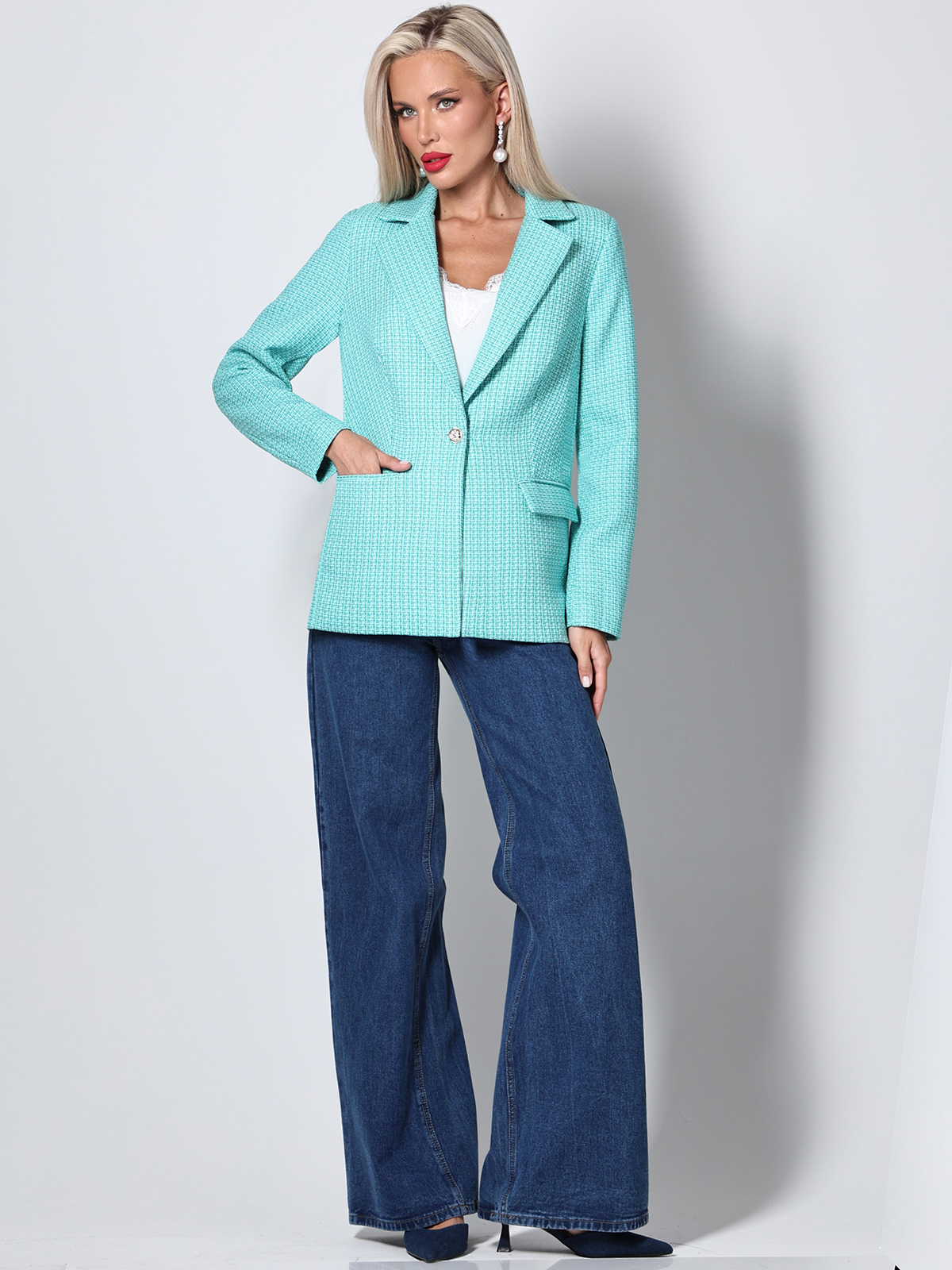 Жакет выполнен из костюмной ткани, обеспечивая элегантный и профессиональный вид. Бирюзовый цвет делает его универсальным и легко сочетаемым с различными элементами гардероба. Застежка на пуговицу обеспечивает легкость при надевании и снятии, а также добавляет изысканности образу. Отложной воротничок придает жакету изысканный вид и подчеркивает его стиль. Длинные рукава делают жакет подходящим для прохладной погоды, обеспечивая комфорт и защиту от холода.