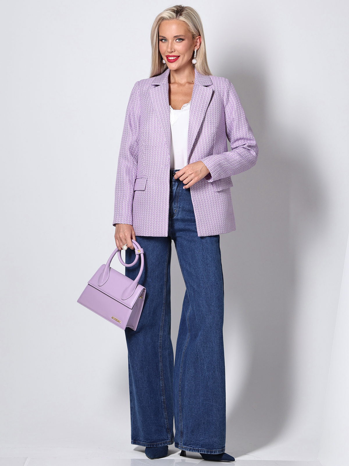 Жакет выполнен из костюмной ткани, обеспечивая элегантный и профессиональный вид. Сиреневый цвет делает его универсальным и легко сочетаемым с различными элементами гардероба. Застежка на пуговицу обеспечивает легкость при надевании и снятии, а также добавляет изысканности образу. Отложной воротничок придает жакету изысканный вид и подчеркивает его стиль. Длинные рукава делают жакет подходящим для прохладной погоды, обеспечивая комфорт и защиту от холода.