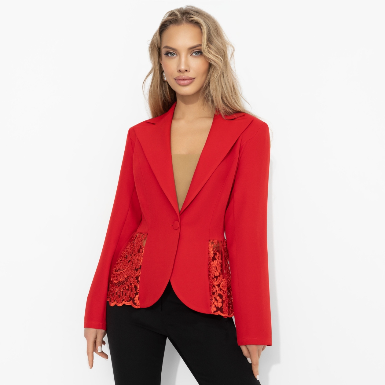 Оверсайз берёт паузу – на сцену выходит ультраженственность. Тренд на микро-жакеты возвращает акцент на талию и линию плеч, и этот алый вариант играет по новым правилам. Правилам нашумевшей экранизации «Грозового перевала» с Марго Роби в главной роли. Приталенный крой формирует силуэт «песочные часы», кружевной акцент добавляет чувственности. Ты не прячешься – ты заявляешь.