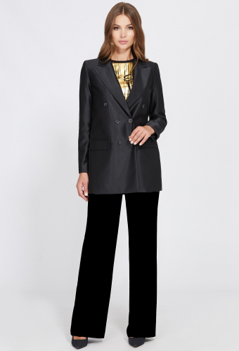 Модель: Солеи 3880 черный Рост: 1..показать64 см (девушка на фото 170см) Сезон: Круглогодичный Тип ткани: 100% полиэстерУдлинённый двубортный жакет прямого силуэта с застёжкой на петли, пуговицы бочком. Перед с горизонтальными карманами с рамками и клапанами. Спинка со средним швом. Рукава втачные двухшовные со шлицами и декоративными пуговицами. Воротник отложной с лацканами. Жакет на подкладке с плечевыми накладками.