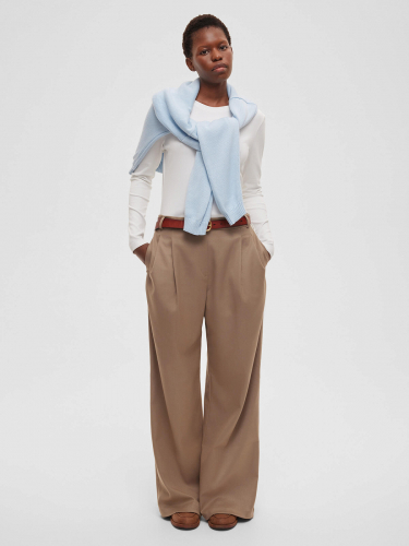 В комплекте с брюками свободного кроя с защипами этот жакет создает гармоничный и современный образ. Такой костюм легко сочетать как с рубашками для официальных мероприятий, так и с футболками и поло для повседневной носки, позволяя вам выглядеть гармонично в любой ситуации.