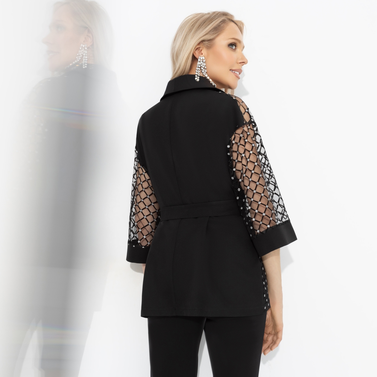 Ваши желания стали смелее. Силуэт уверенный, энергия – тёплая, а настроение – будто в воздухе растворён флирт. Жакет действует как талисман любви: он не меняет вас, он раскрывает вас. Тех, кто замечает этот свет, жизнь приводит сама. Любовь рядом – потому что вы в резонансе. Жакет из костюмной ткани с фактурной сеткой. Отлично смотрится на разных типах фигур.