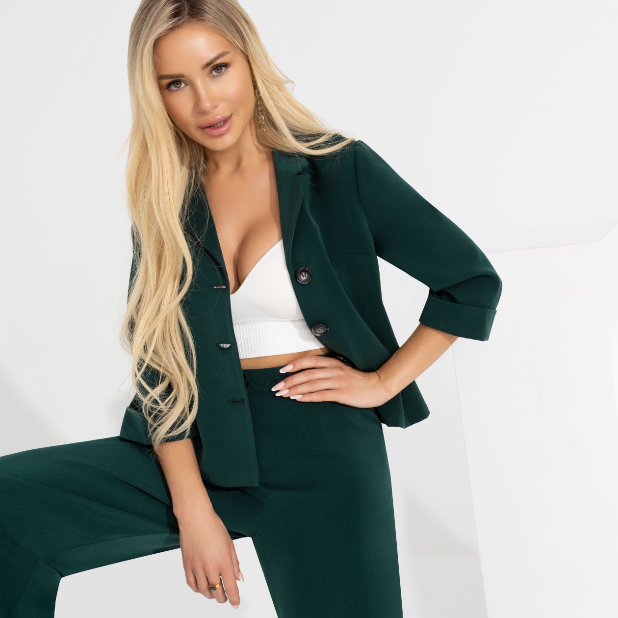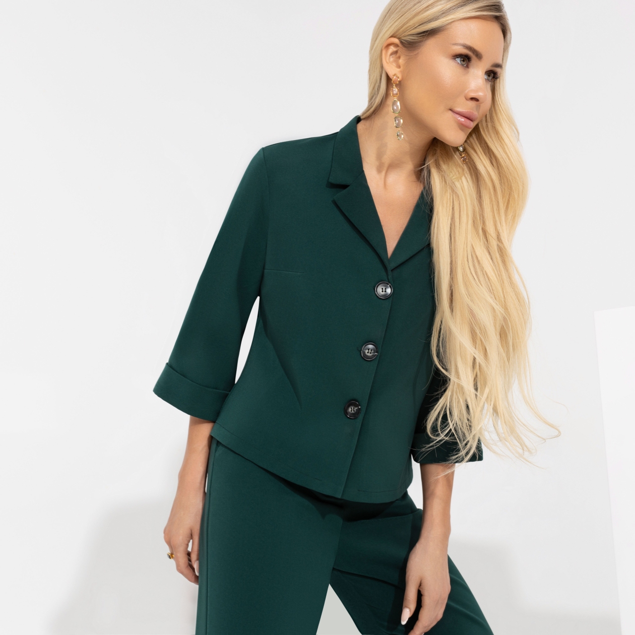 Жакет для создания подиумного образа. Оттенок идеально оттеняет загар, укороченный рукав подчеркивает изящность запястий. Крупные пуговицы делают силуэт устойчивым. Идеален в сочетании с брюками того же оттенка.