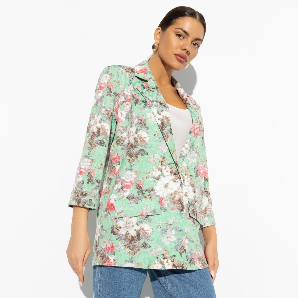 Сочетание высококачественного «коттон жаккарда» и изысканного дизайна делает этот жакет уникальным предложением на рынке. Его трехчетвертные рукава добавляют элегантности и утонченности, что позволяет легко сочетать его как с джинсами для повседневного образа, так и с нарядными юбками для более торжественных случаев. Оптовые покупки этого жакета позволят вашему магазину предложить своим клиентам модные и универсальные изделия, которые станут основой любого гардероба.
