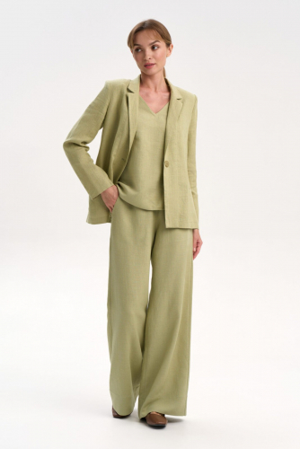 Жакет женский полуприлегающего силуэта, среднего объёма. Прилегание образуется за счёт рельефов  по спинке и вытачек по полочке. Рукав втачной двухшовный. Воротник «английский» пиджачного типа. Застёжка центральная на одну пуговицу. Карманы прорезные с втачной листочкой.