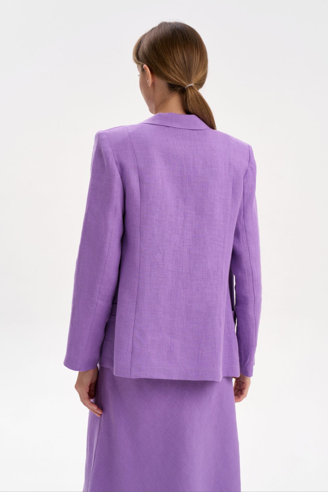 Жакет женский полуприлегающего силуэта, среднего объёма. Прилегание образуется за счёт рельефов  по спинке и вытачек по полочке. Рукав втачной двухшовный. Воротник «английский» пиджачного типа. Застёжка центральная на одну пуговицу. Карманы прорезные с втачной листочкой.
