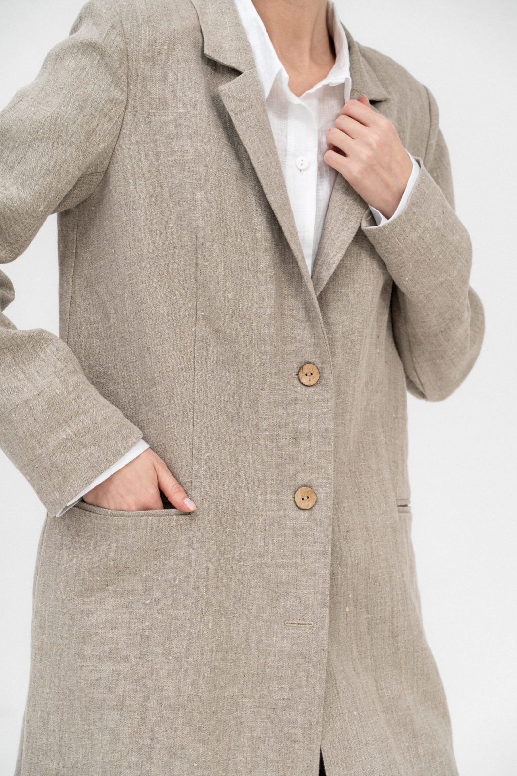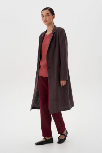 Жакет длинный прямого силуэта с прорезным карманом в рамку, рельефами по спинке и шлицей в среднем шве. Рукав втачной двухшовный. Застёжка центральная на 3 пуговицы. Воротник «английский» пиджачного типа.