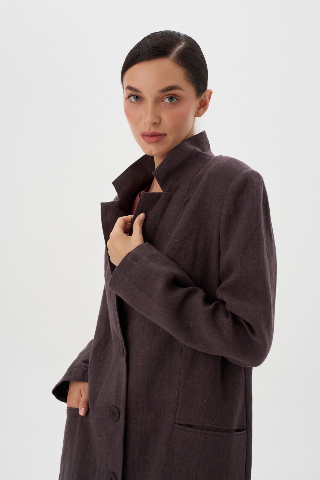 Жакет длинный прямого силуэта с прорезным карманом в рамку, рельефами по спинке и шлицей в среднем шве. Рукав втачной двухшовный. Застёжка центральная на 3 пуговицы. Воротник «английский» пиджачного типа.