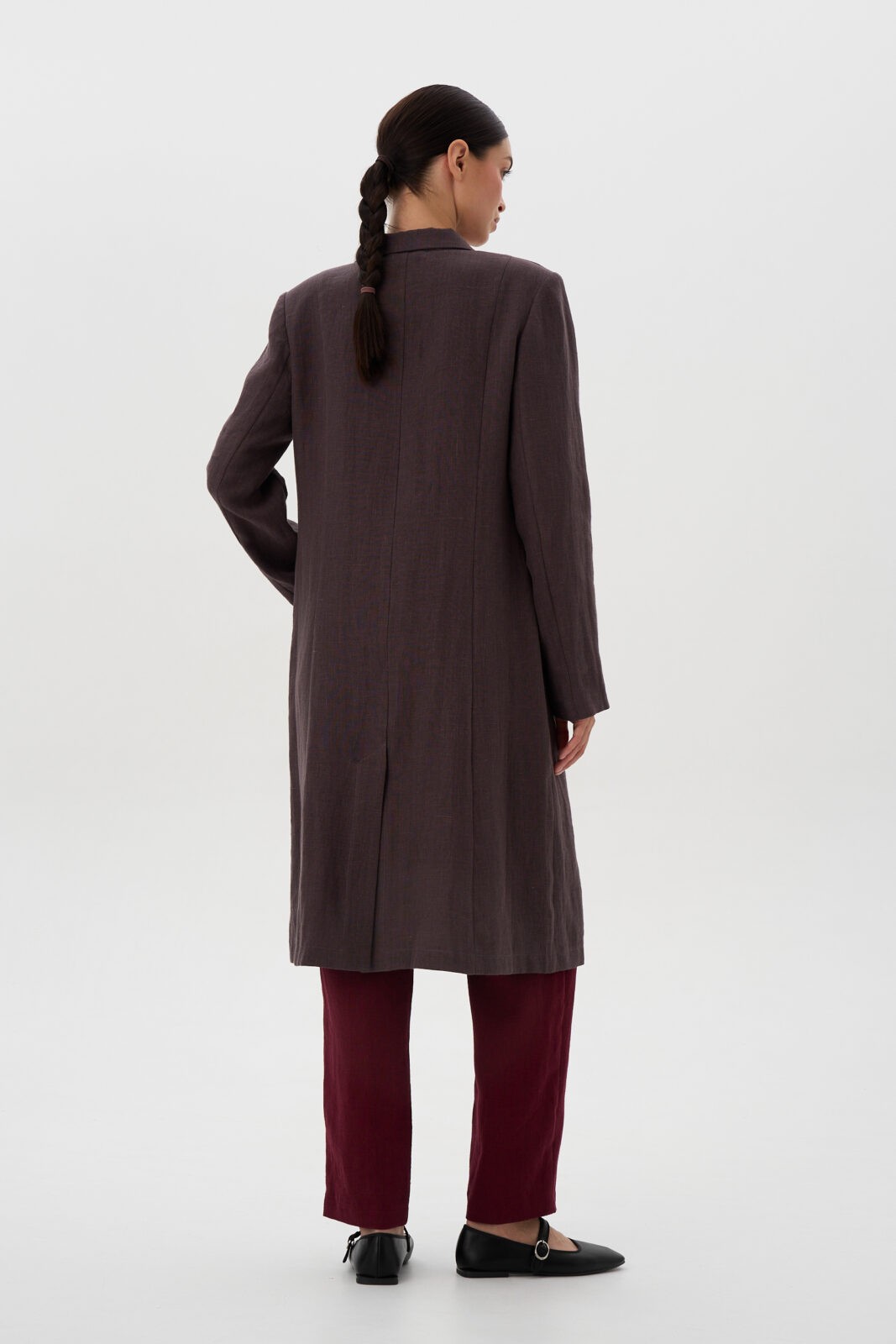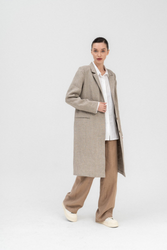 Жакет длинный прямого силуэта с прорезным карманом в рамку, рельефами по спинке и шлицей в среднем шве. Рукав втачной двухшовный. Застёжка центральная на 3 пуговицы. Воротник «английский» пиджачного типа.