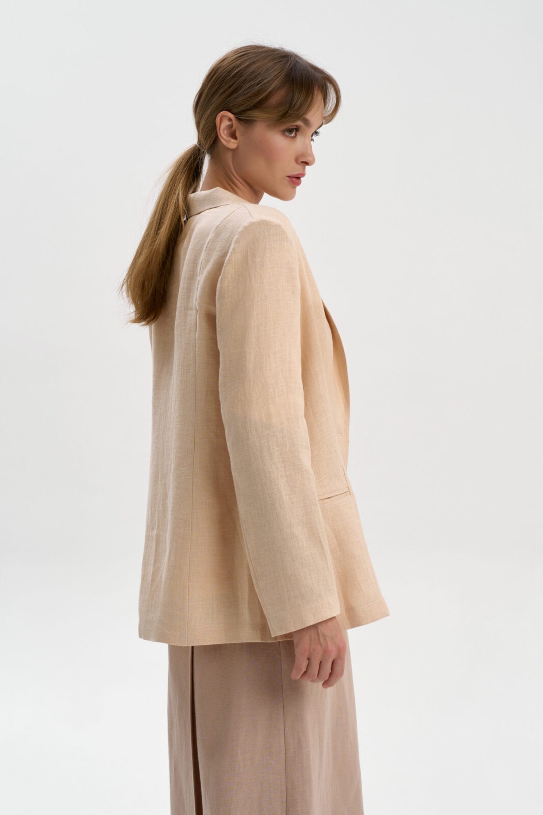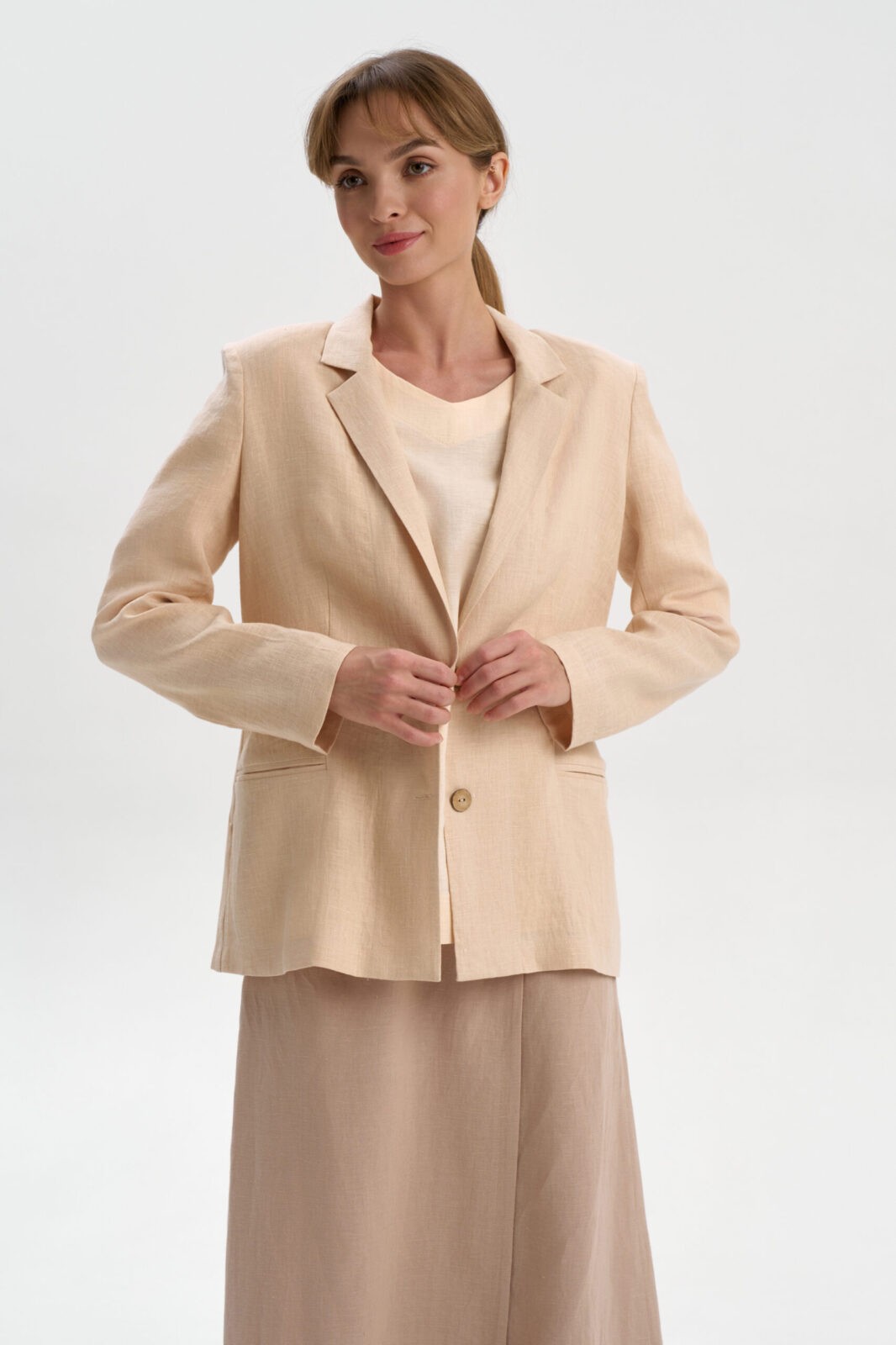 Жакет женский полуприлегающего силуэта с прорезным карманом в рамку и рельефами по спинке. Рукав втачной двухшовный длинный. Застёжка центральная на 2 пуговицы. Воротник «английский» пиджачного типа.